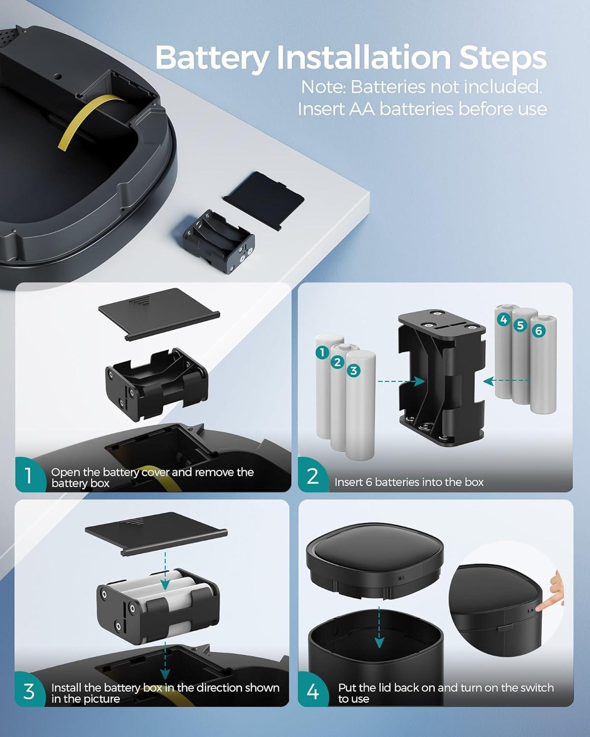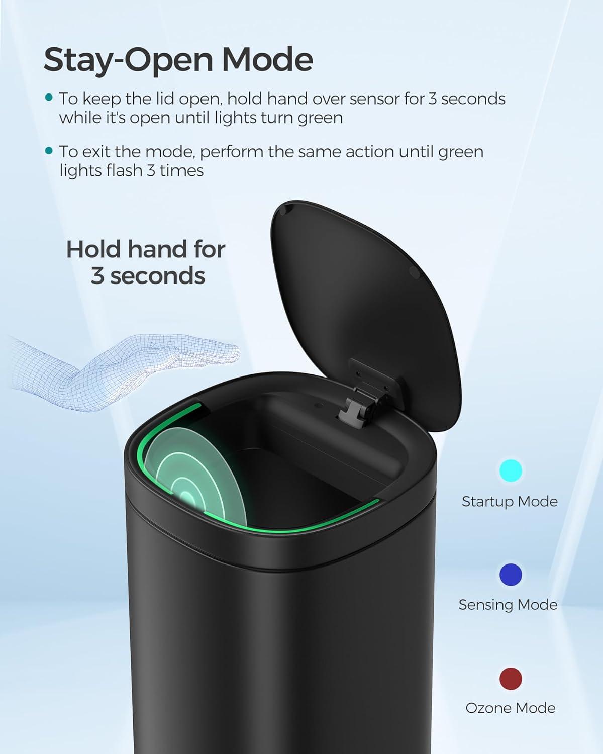 【4 LIGHT-INDICATED MODES】This automatic trash can boasts 4 working modes, each indicated by different lights: aqua for startup, blue for sensing, red for deodorizing, and green for stay-open, showcasing its intelligence