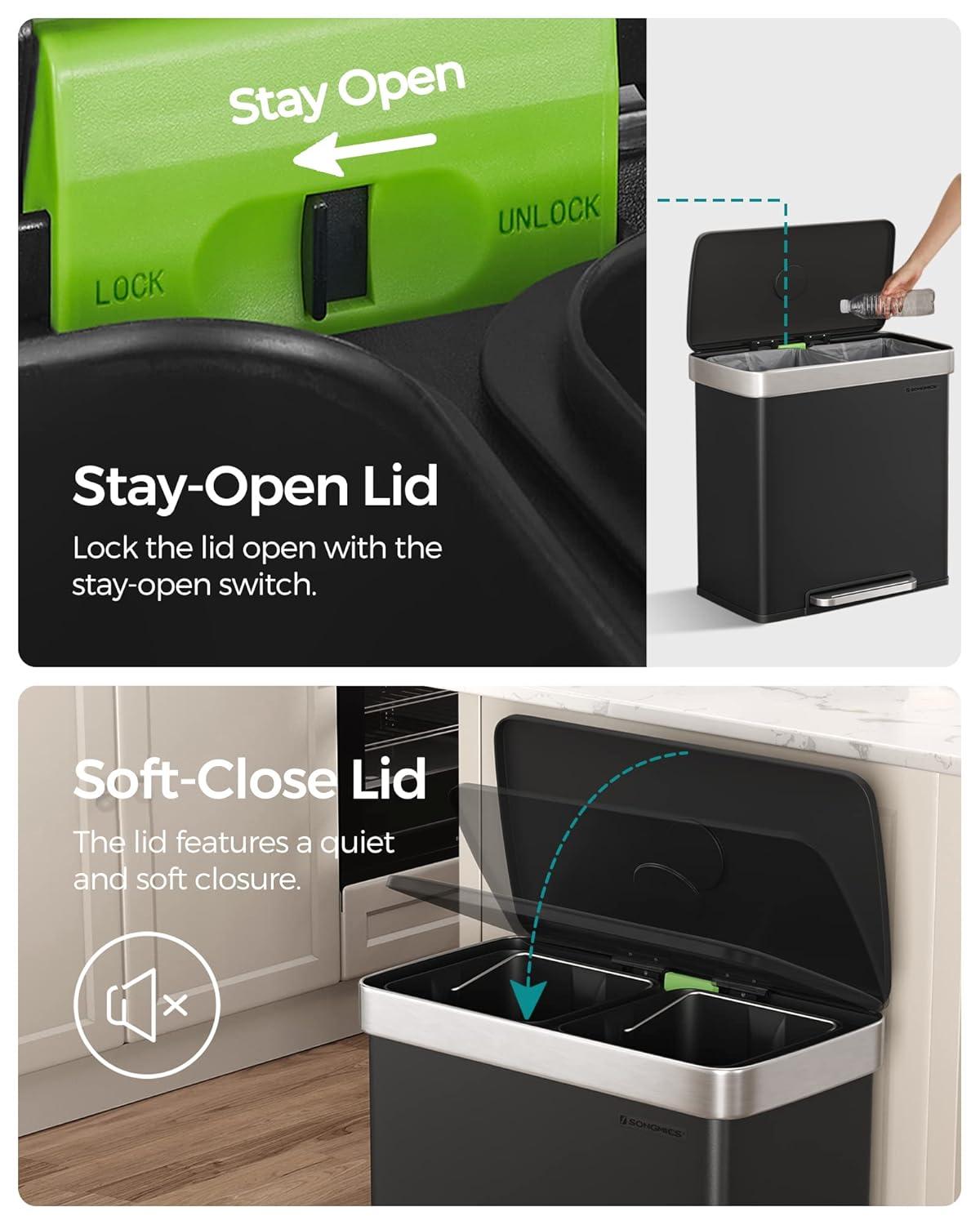 [Dual Compartments & Liners] With two 8-gallon compartments, this dual trash can helps sort normal waste and recyclables in your kitchen; it comes with 15 custom-fit SONGMICS trash bags (code 30A), which are designed to perfectly fit this garbage can