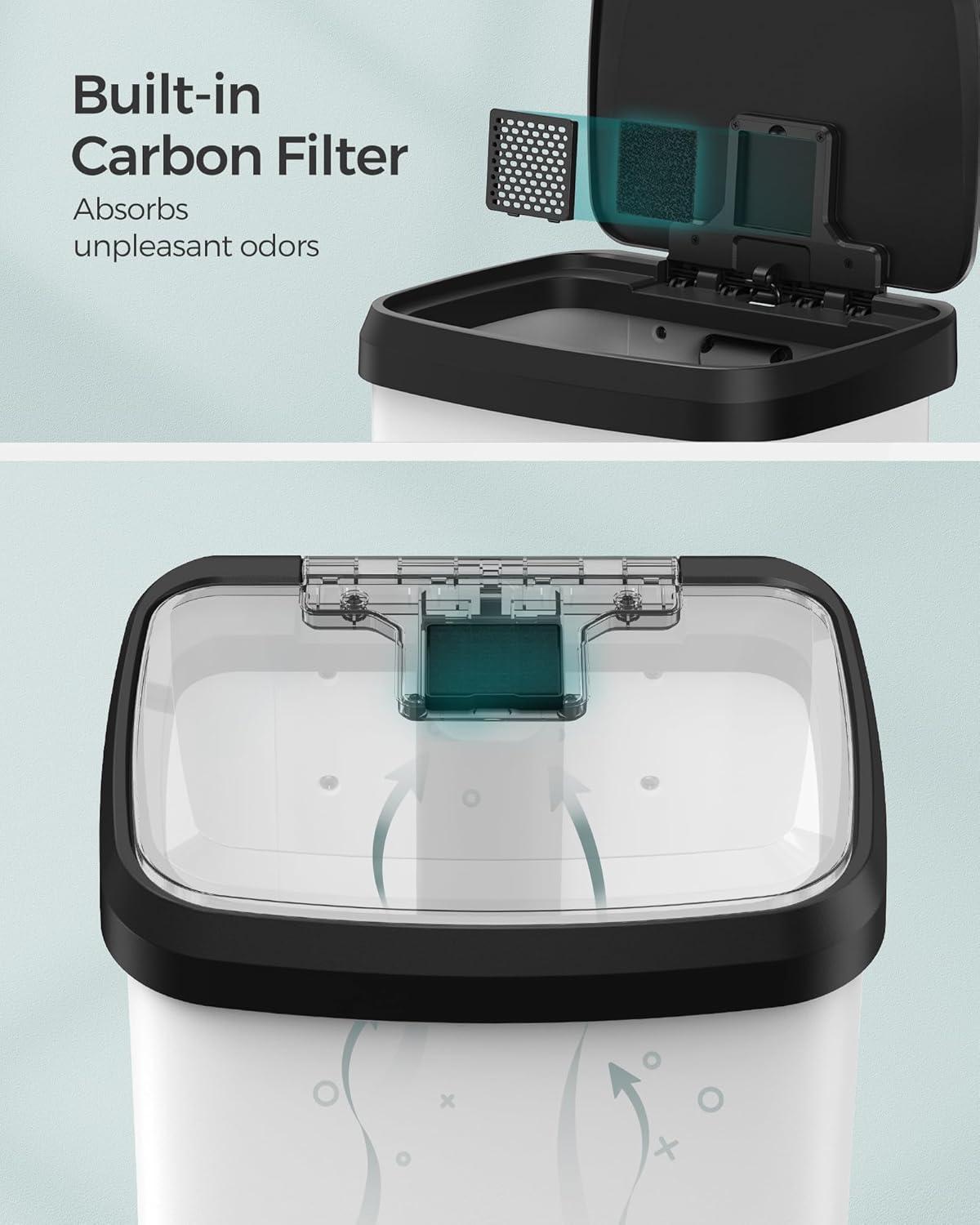 [Thoughtful Detailing] The carbon filter in the lid helps absorb unpleasant odors, keeping your kitchen smelling fresh. Included are 15 liner bags (16-18 gallons) that perfectly fit this kitchen can