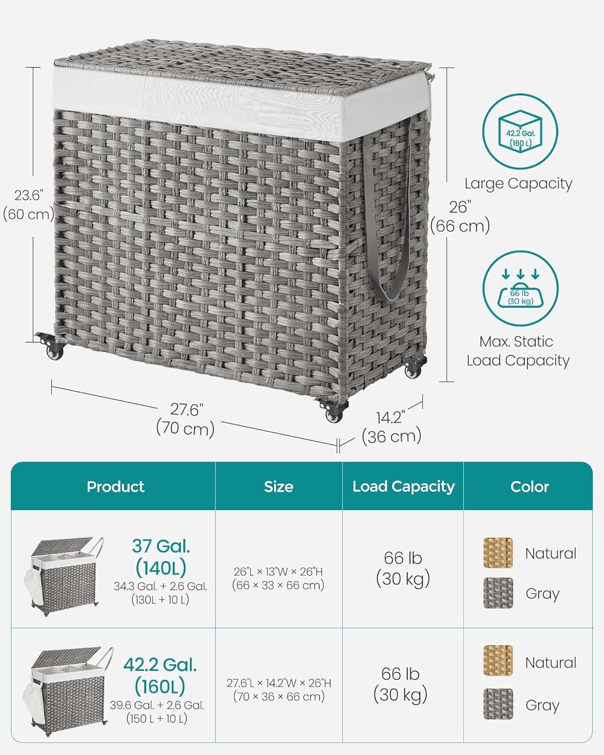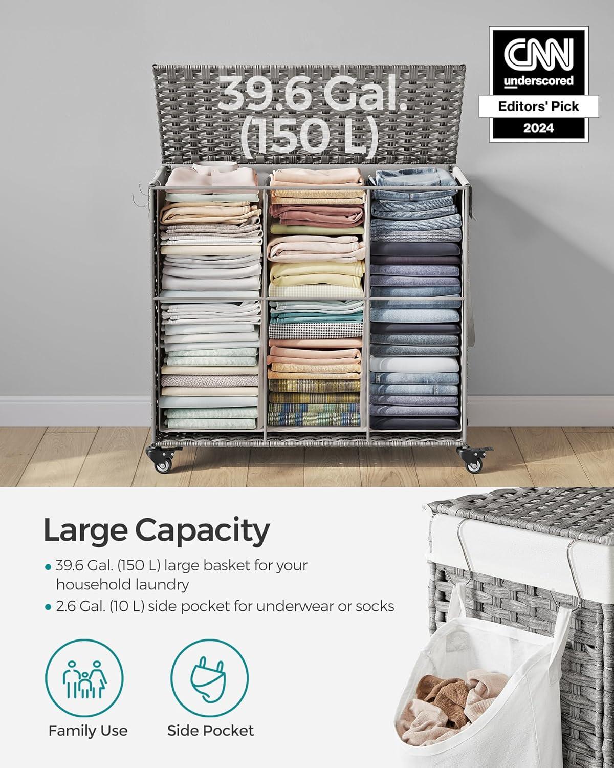 【LARGE 42.3-GALLON (160 L) CAPACITY】This hamper offers a large total 42.3-gallon capacity, with a 39.6-gallon (150 L) basket that is ideal for organizing your family's laundry, and a 2.6-gallon (10 L) side pocket for storing underwear or other small items