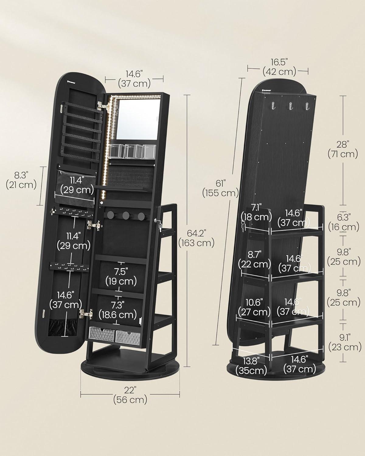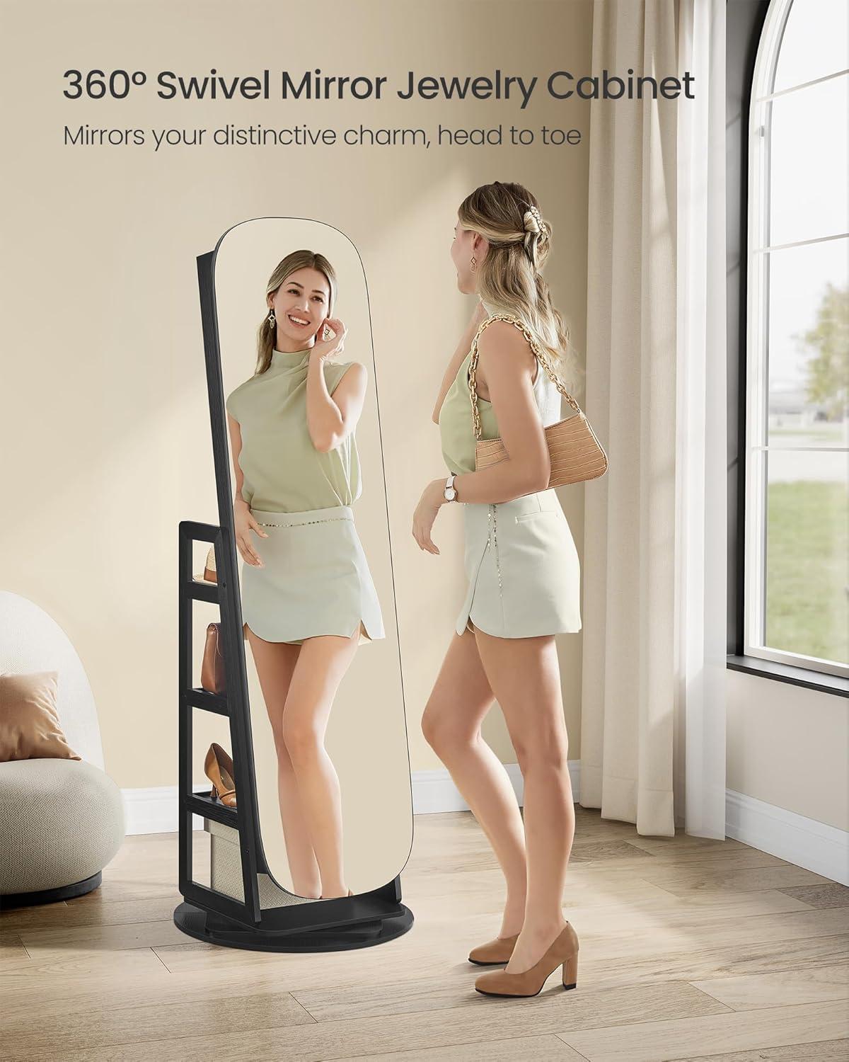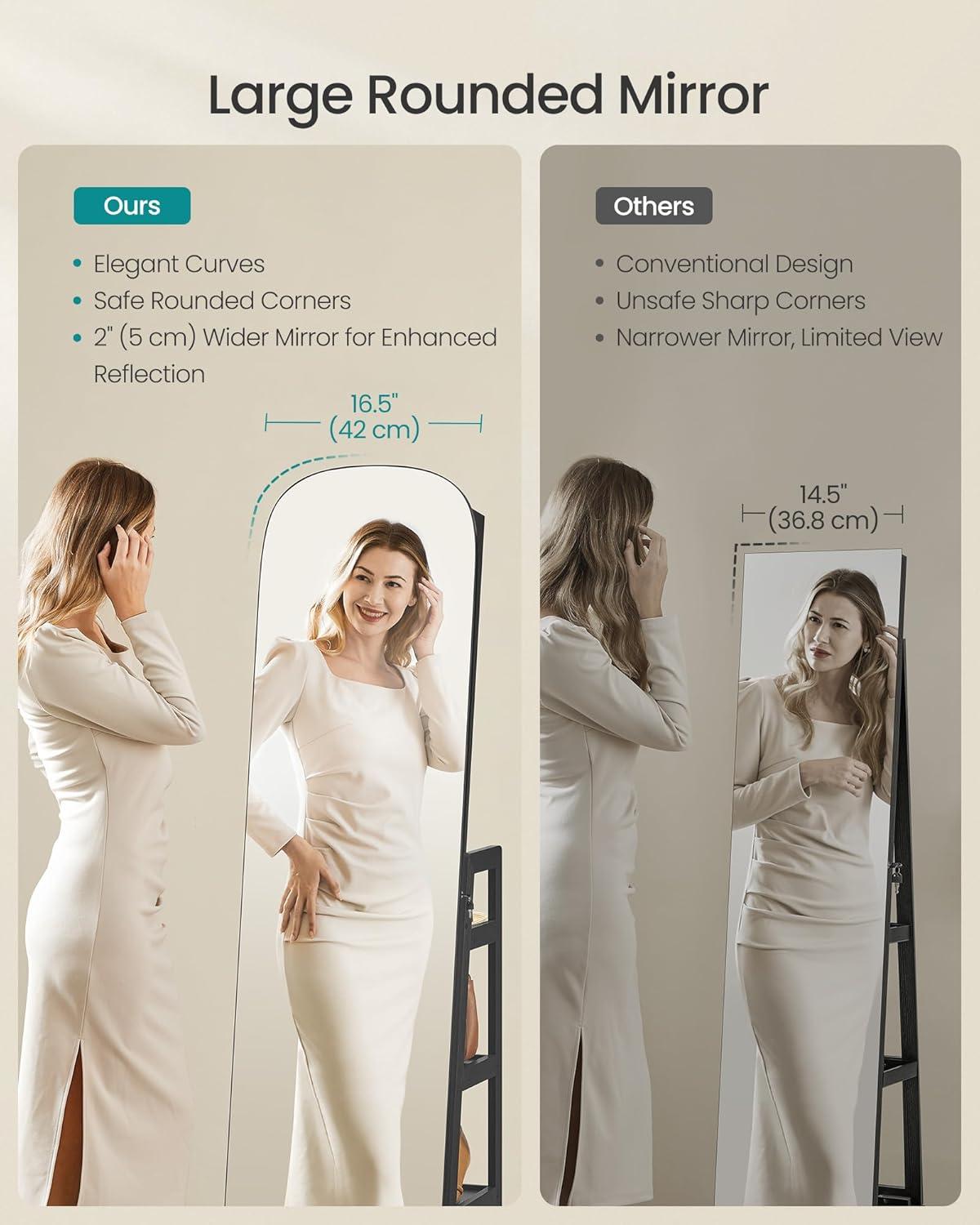 【CHIC MODERN AESTHETIC】Enhance any room with this elegant full-length mirror with rounded edges, merging modern elegance with practical functionality. Its floating effect creates a captivating focal point, cleverly hiding jewelry storage behind the mirror