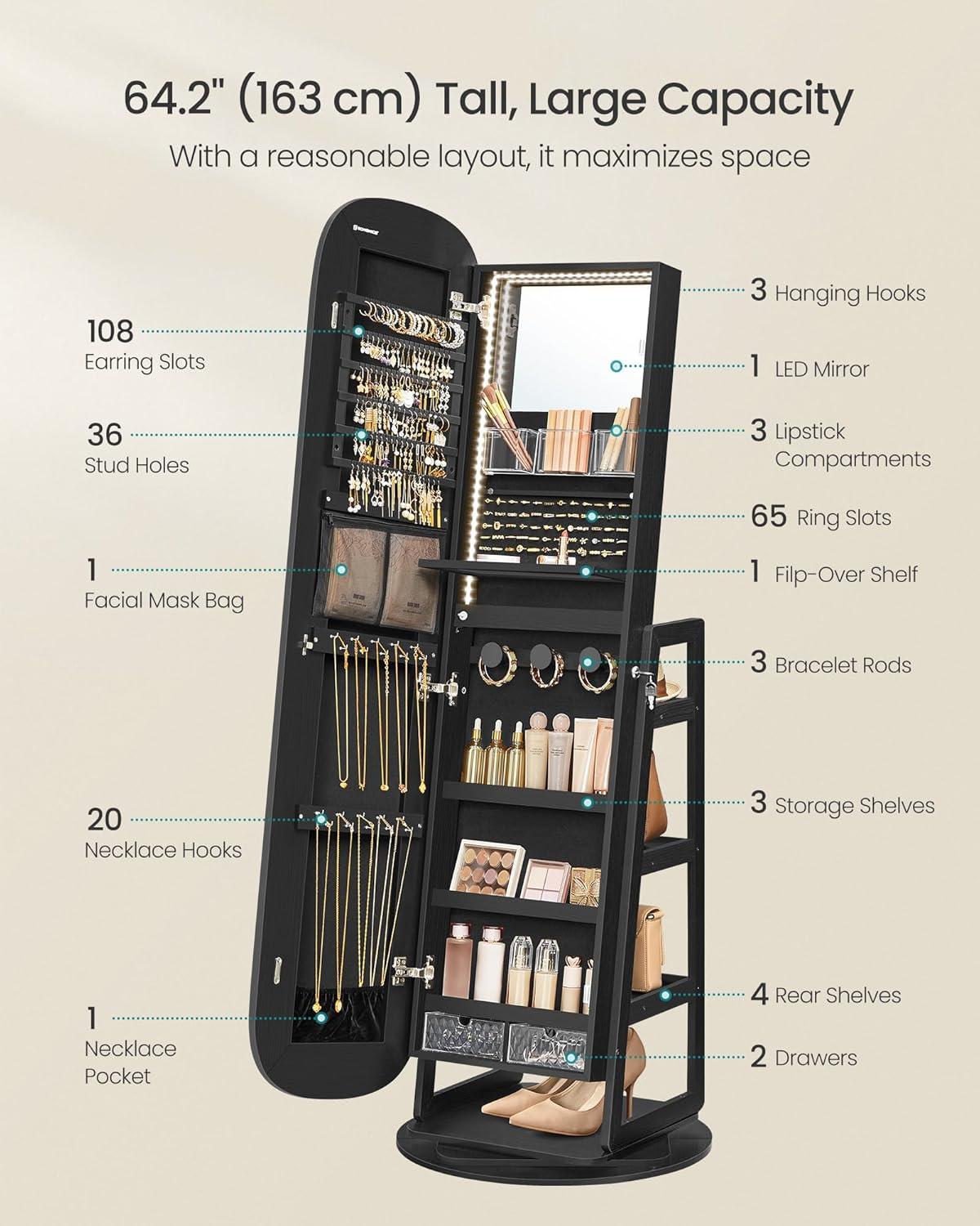 【MASSIVE STORAGE】108 earring slots, 36 stud earring holes, 20 necklace hooks, 65 ring slots, 3 bracelet rods—the jewelry jungle ends in this standing mirror jewelry cabinet. Plus, there are 3 compartments, 2 drawers, 4 shelves, and a bag for your makeup!