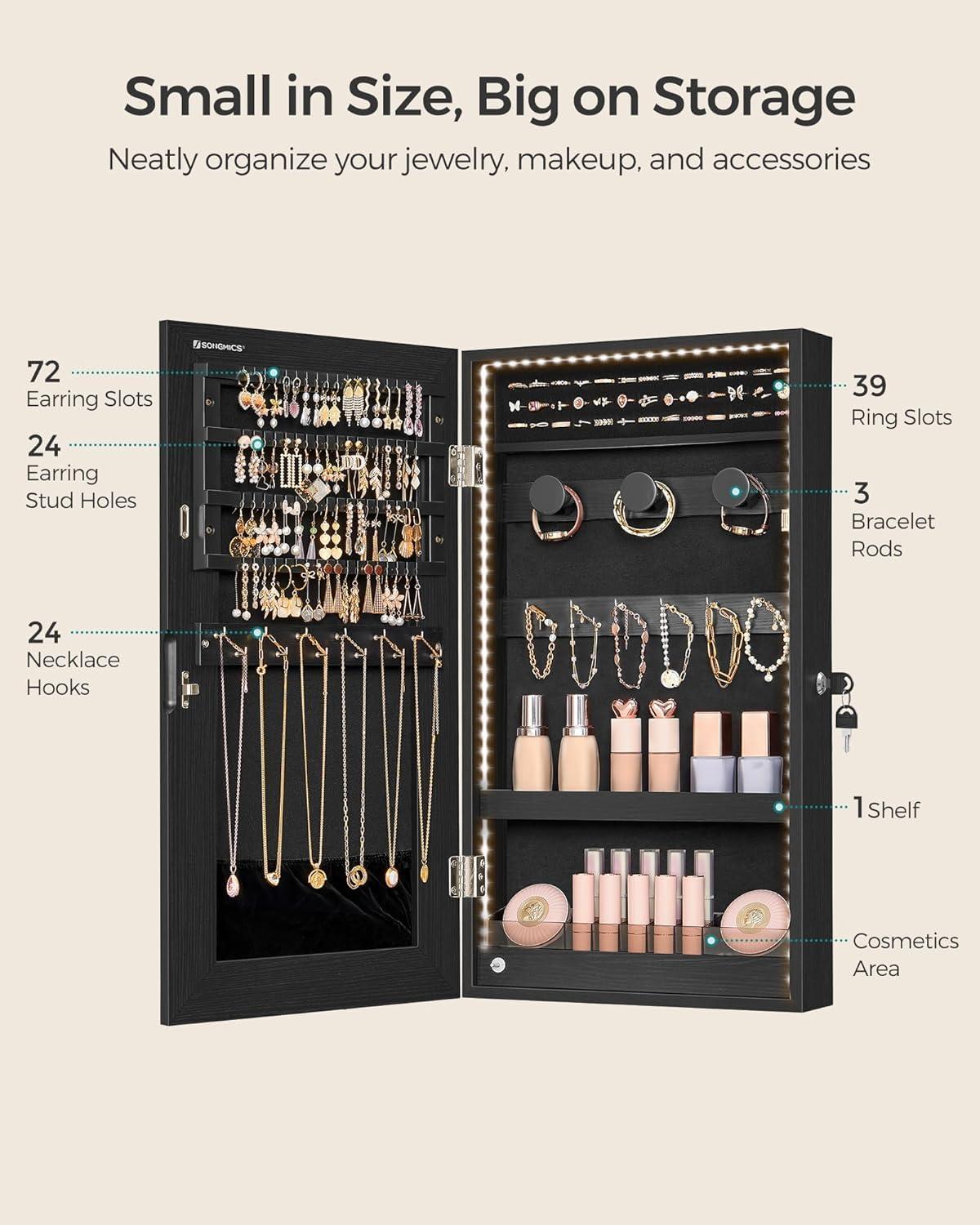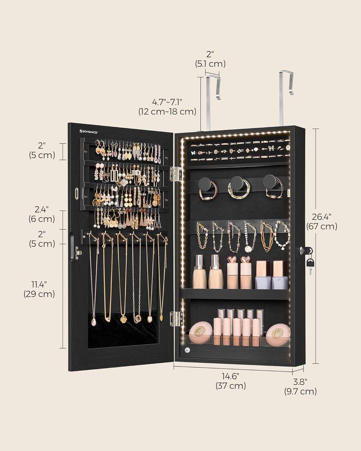[Space-Saving yet Spacious] 3.9''D x 14.6''W x 26.4''H occupies little wall space, but offers large storage room with 2 compartments, 60 ring holes, 64 earring slots, 24 stud holes, and 24 necklace hooks