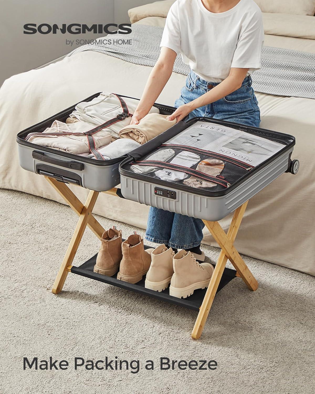 SONGMICS Luggage Rack, Bamboo Luggage Rack for Guest Room, Folding Suitcase Stand, for Hotel, Bedroom, Heavy-Duty, Holds up to 131 lb, Natural Beige URLR007N01(Cloud White)