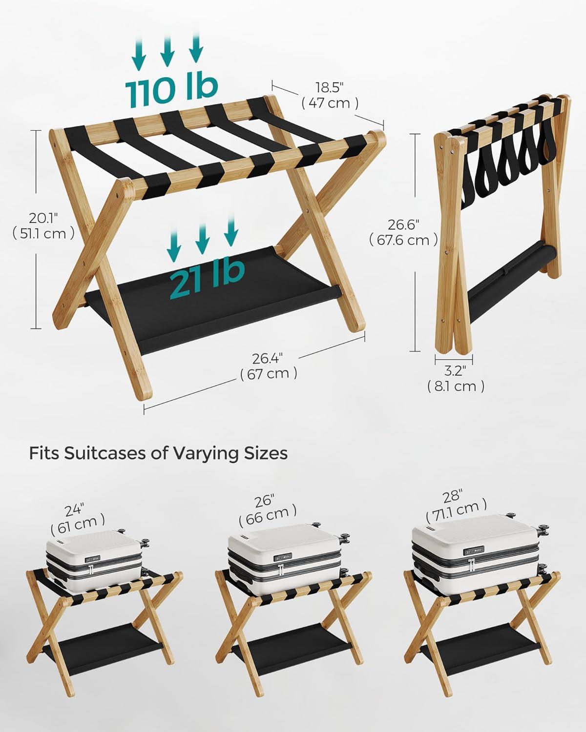 [Wider and Foldable] This 26.4”D x 18.5”W x 20.1”H (67 x 47 x 51.1 cm) luggage rack, that’s wider than similar ones, can hold 24”, 26”, or 28” suitcases. It folds to a 26.4”D x 3.2”W x 26.6”H (67 x 8.1 x 67.6 cm) size for easy storage in closets or corners
