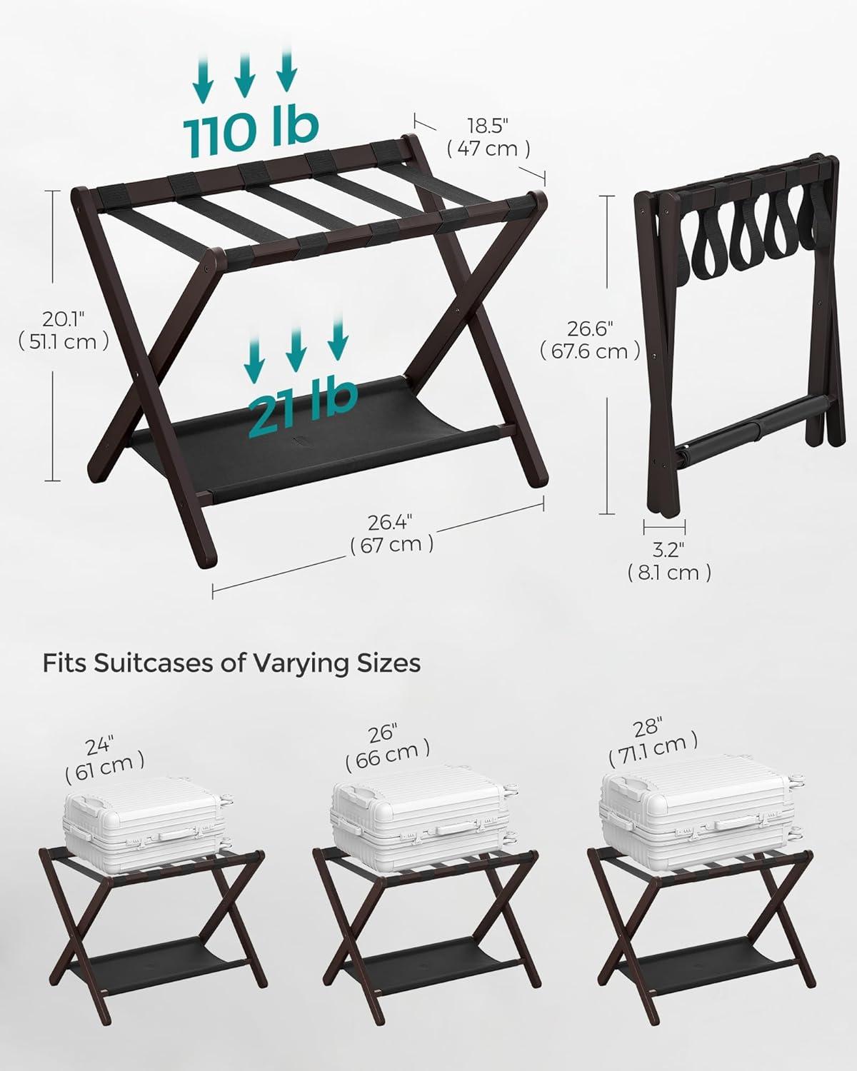 [Wider and Foldable] This 26.4”D x 18.5”W x 20.1”H (67 x 47 x 51.1 cm) luggage rack, that’s wider than similar ones, can hold 24”, 26”, or 28” suitcases. It folds to a 26.4”D x 3.2”W x 26.6”H (67 x 8.1 x 67.6 cm) size for easy storage in closets or corners