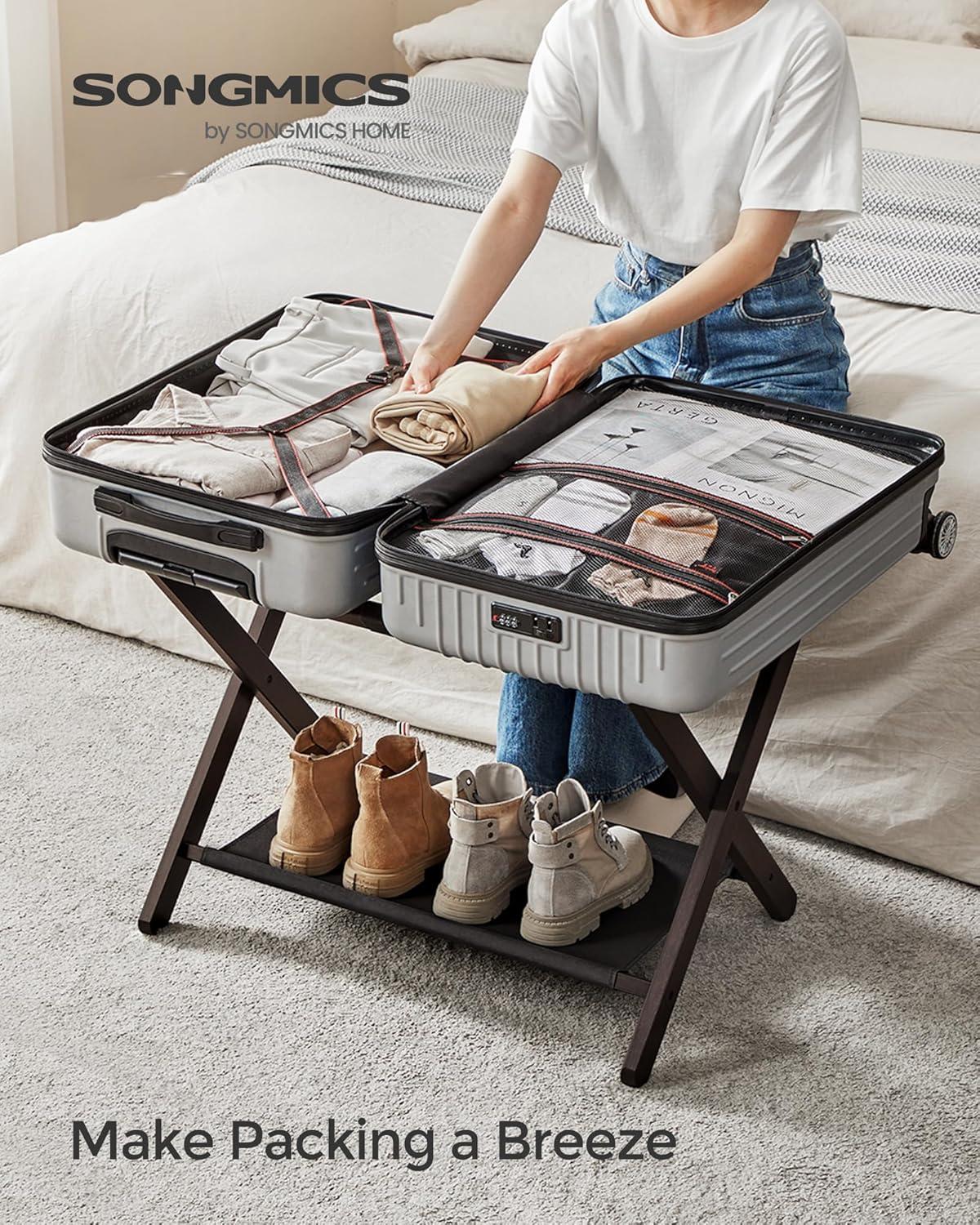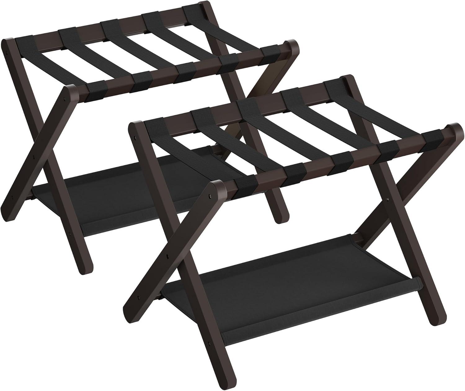 SONGMICS Luggage Rack, Folding Suitcase Stand with Storage Shelf, for Guest Room, Hotel, Bedroom, Heavy-Duty, Holds up to 131 lb, Classic White URLR007W01(Expresso)