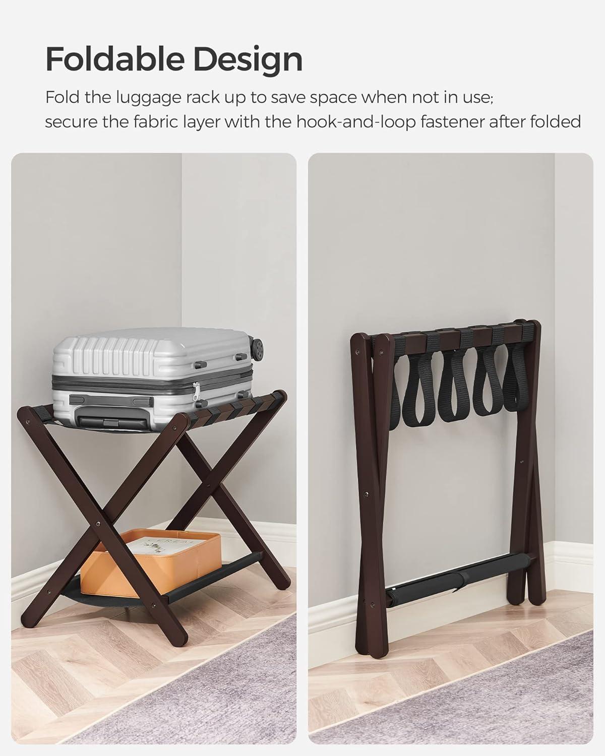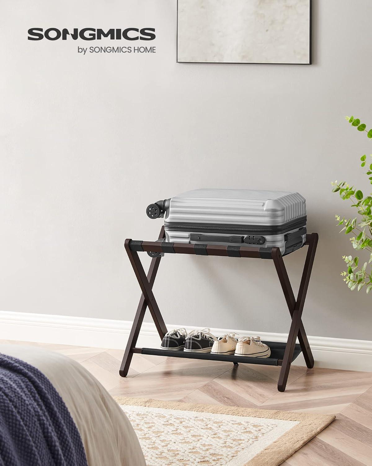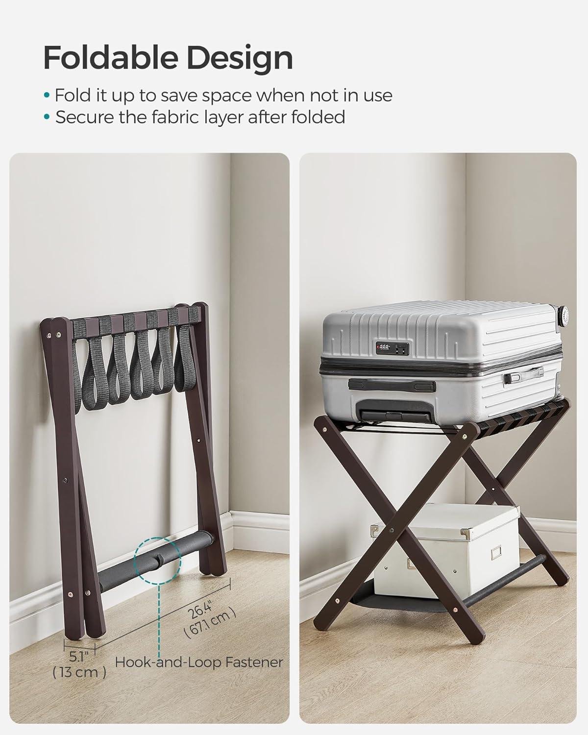 SONGMICS Luggage Rack, Folding Suitcase Stand with Storage Shelf, for Guest Room, Hotel, Bedroom, Heavy-Duty, Holds up to 131 lb, Classic White URLR007W01(Walnut Brown)