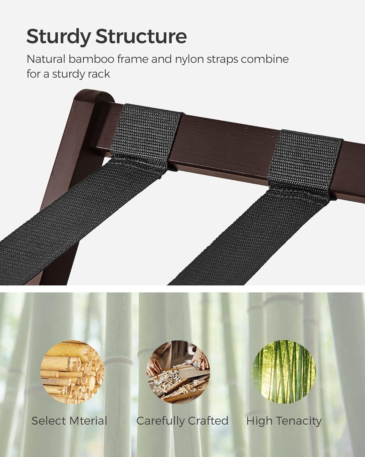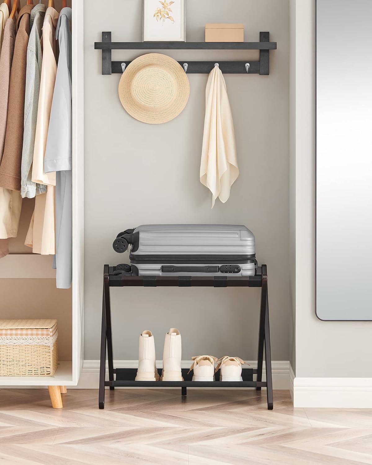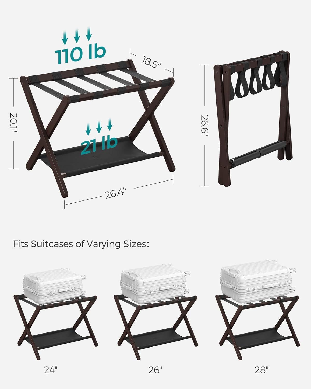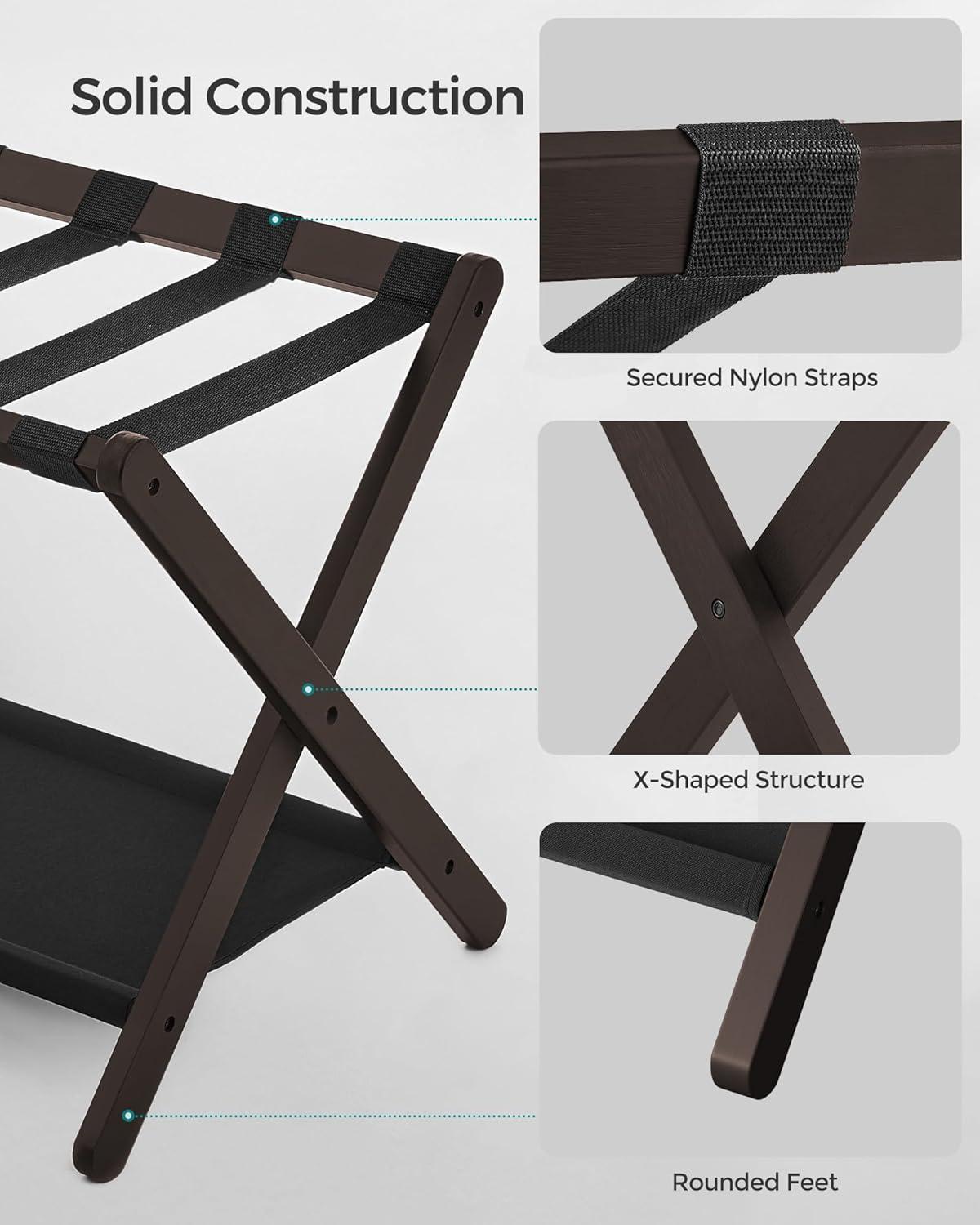 SONGMICS Luggage Rack, Folding Suitcase Stand with Storage Shelf, for Guest Room, Hotel, Bedroom, Heavy-Duty, Holds up to 131 lb, Classic White URLR007W01(Walnut Brown)