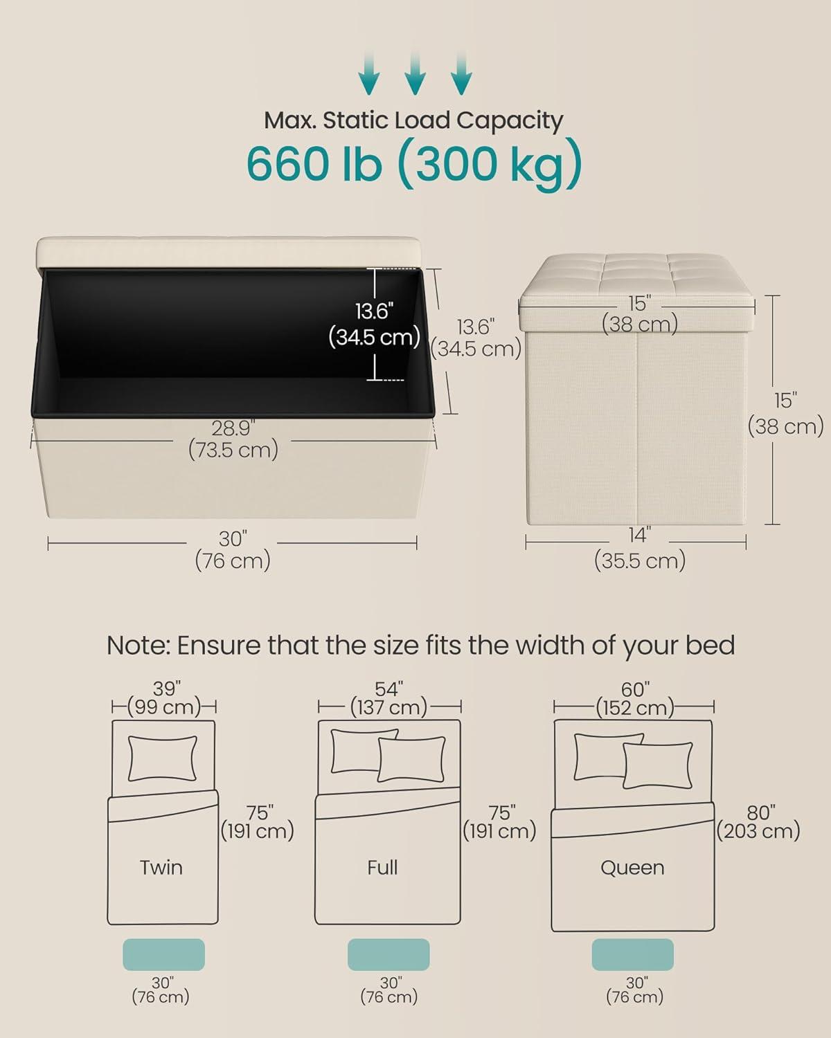 【QUICK ASSEMBLY, EASY FOLDAWAY】This storage ottoman from the SONGMICS MAZIE Collection has a foldable design that allows quick setup in seconds by simply inserting the bottom panel. Easily fold and store it under the bed or in a closet when not in use