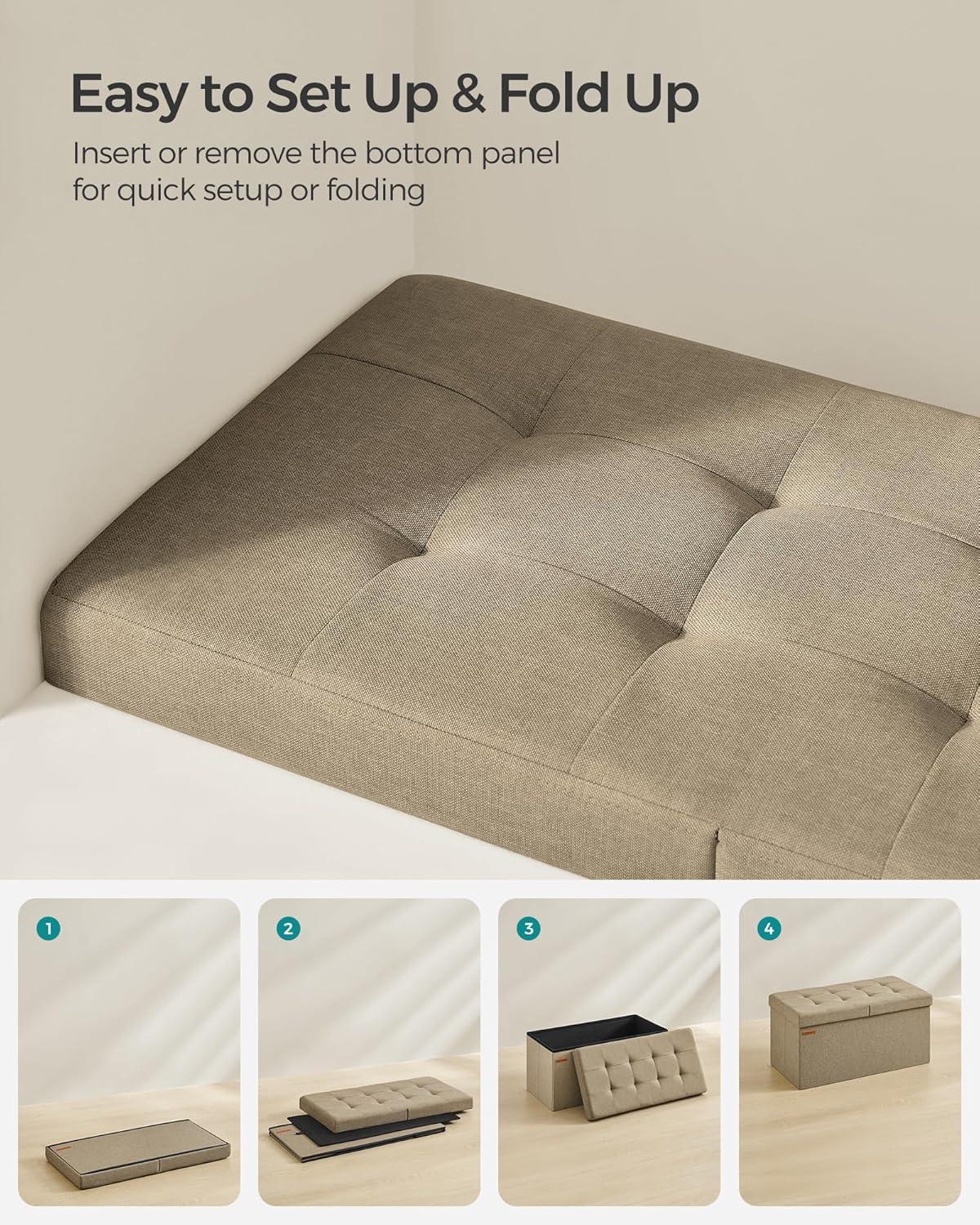 【QUICK ASSEMBLY, EASY FOLDAWAY】This storage ottoman from the SONGMICS MAZIE Collection has a foldable design that allows quick setup in seconds by simply inserting the bottom panel. Easily fold and store it under the bed or in a closet when not in use
