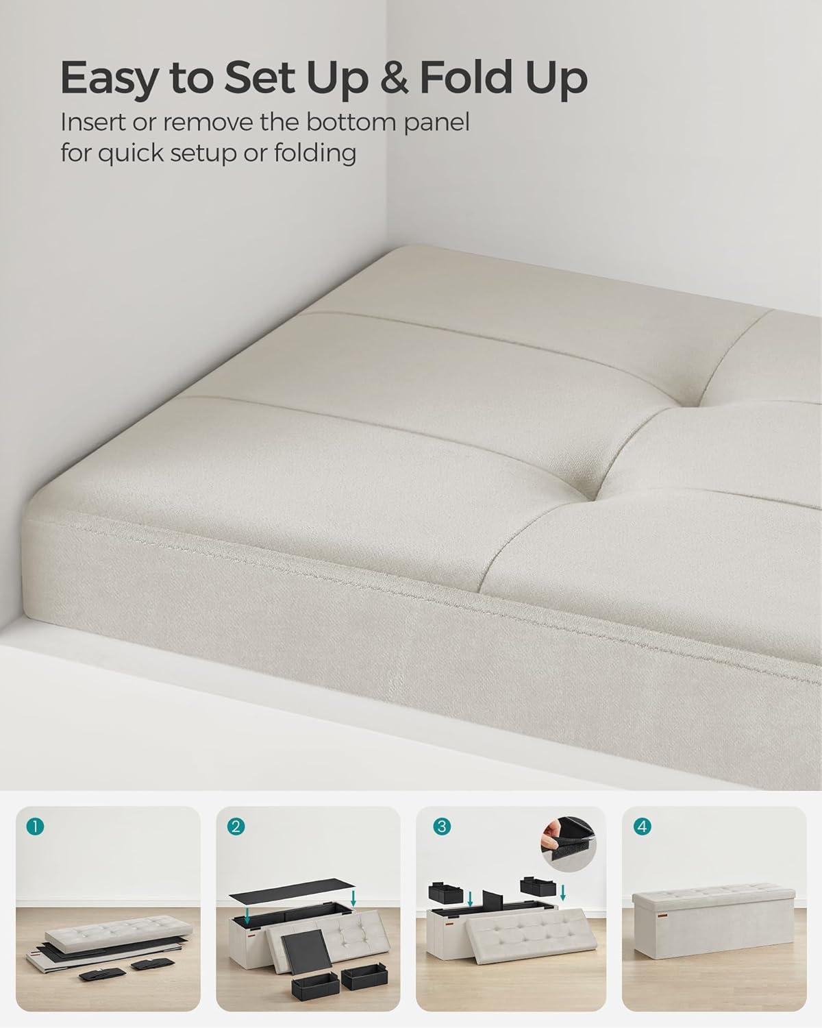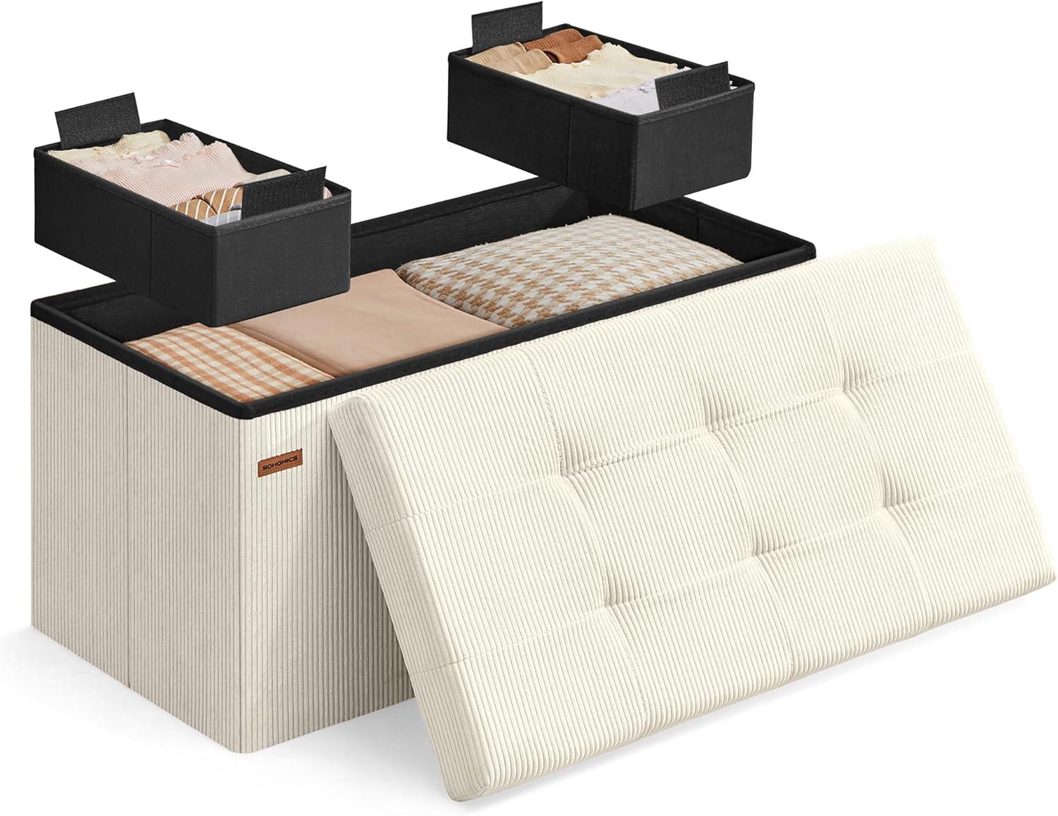 SONGMICS Mazie Collection - Storage Ottoman Bench, Foldable Foot Rest, 15 x 30 x 15 Inches, End of Bed Bench, Storage Chest, Load 660 lb, Living Room, Bedroom, Entryway, Cream White ULSF603W01(Cream White)