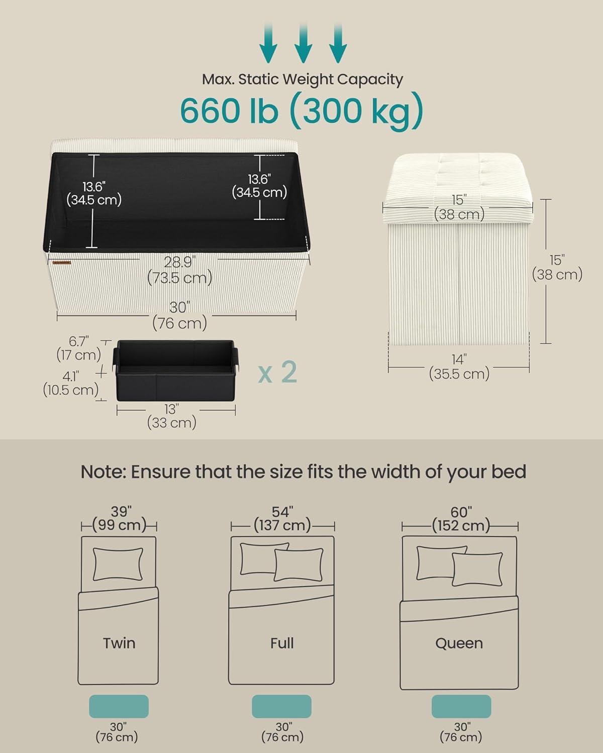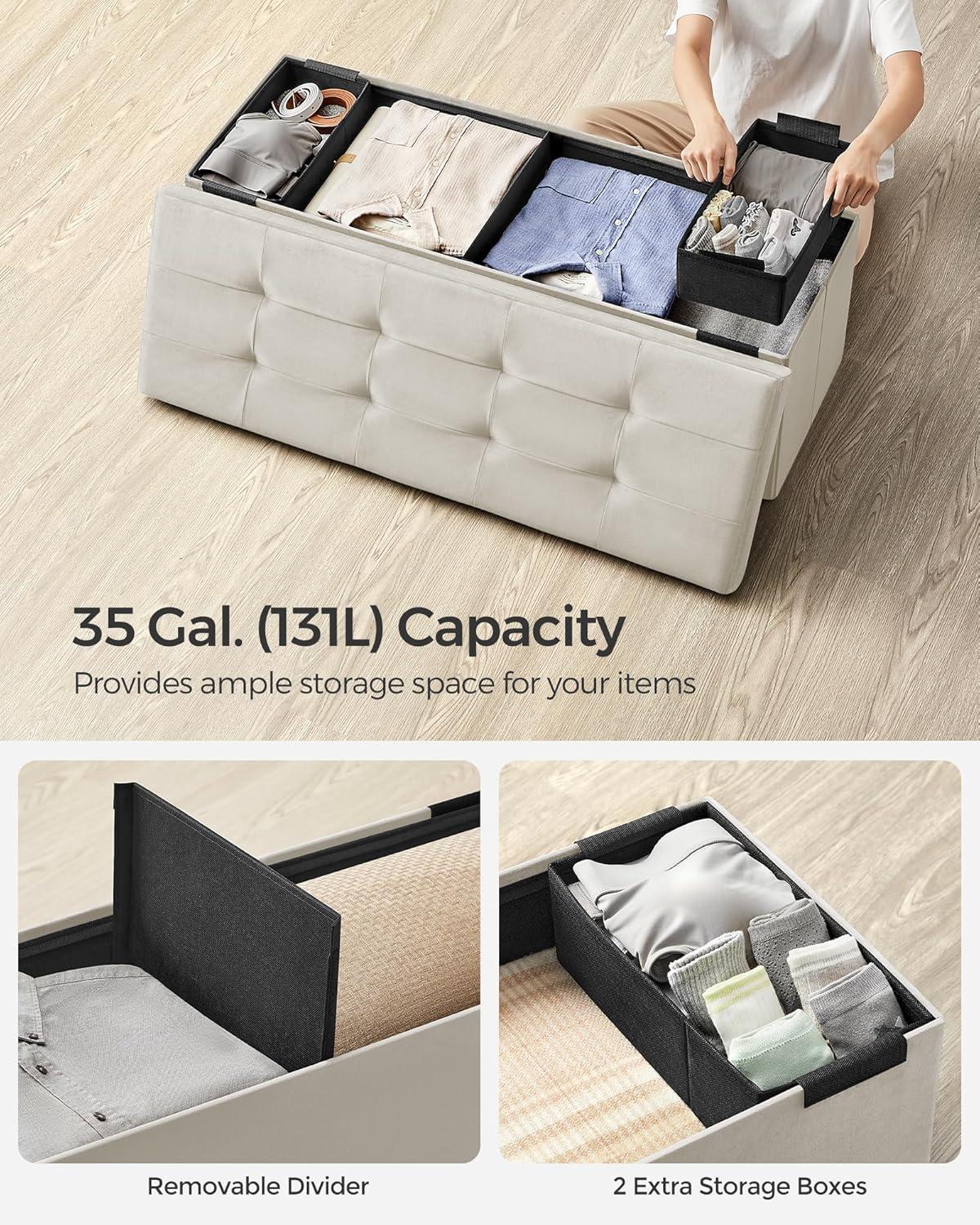 Ample Storage: Sized at 15″D x 30″W x 15″H (38 x 76 x 38 cm), this storage bench offers a 24-gallon (89 L) capacity for storing books, blankets, and more. It also features 2 storage boxes for socks, underwear, and other small items