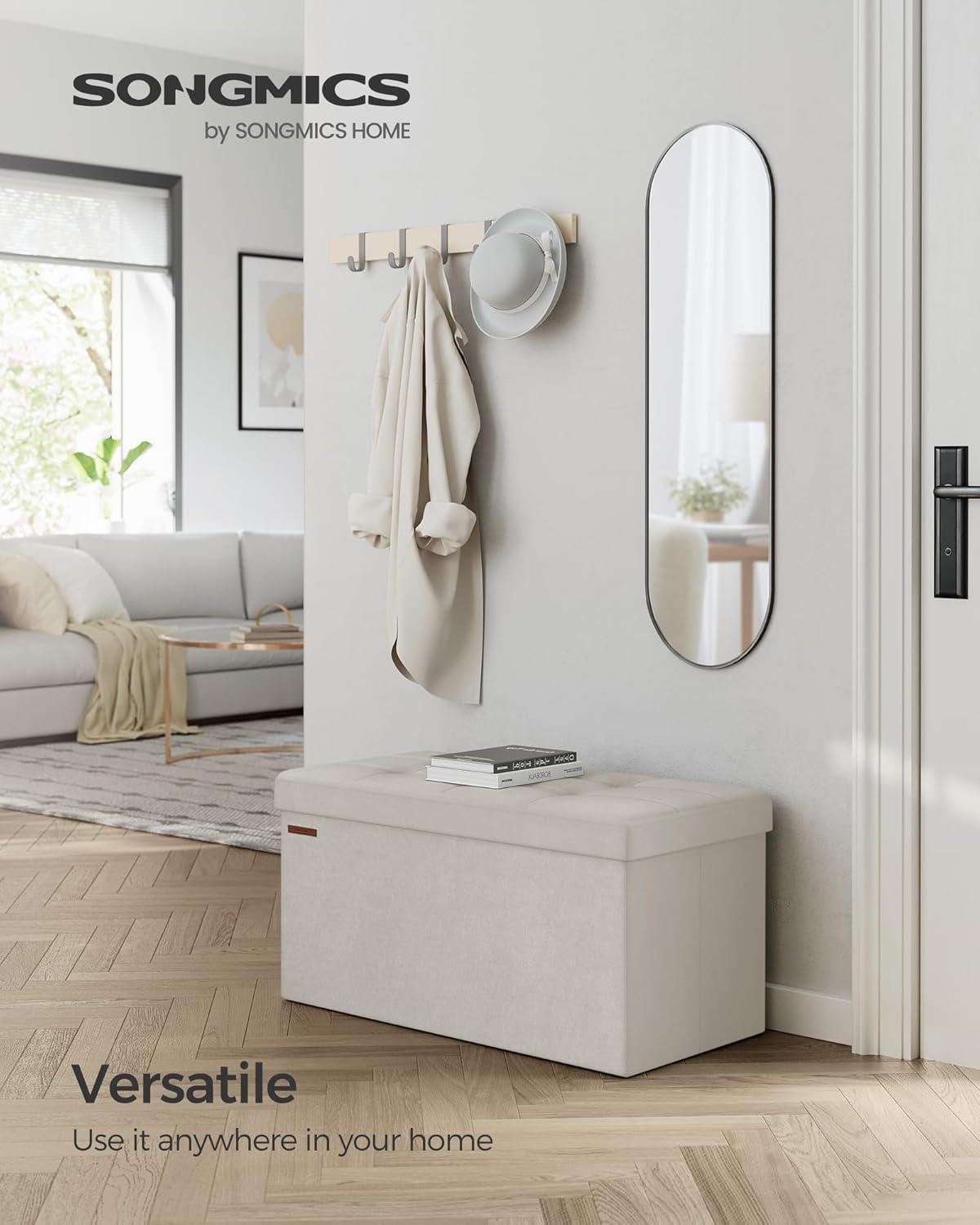 SONGMICS Mazie Collection – Storage Ottoman Bench, Foldable Foot Rest, 15 x 30 x 15 Inches, End of Bed Bench, Storage Chest, Load 660 lb, Living Room, Bedroom, Entryway, Cream White ULSF603W01(Cream White)