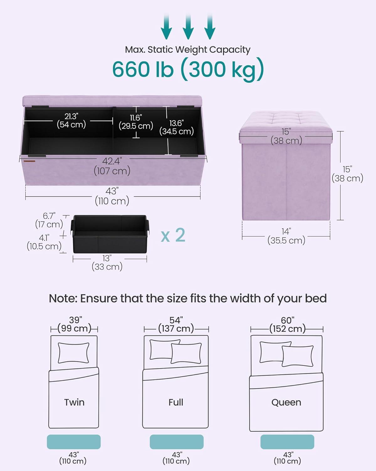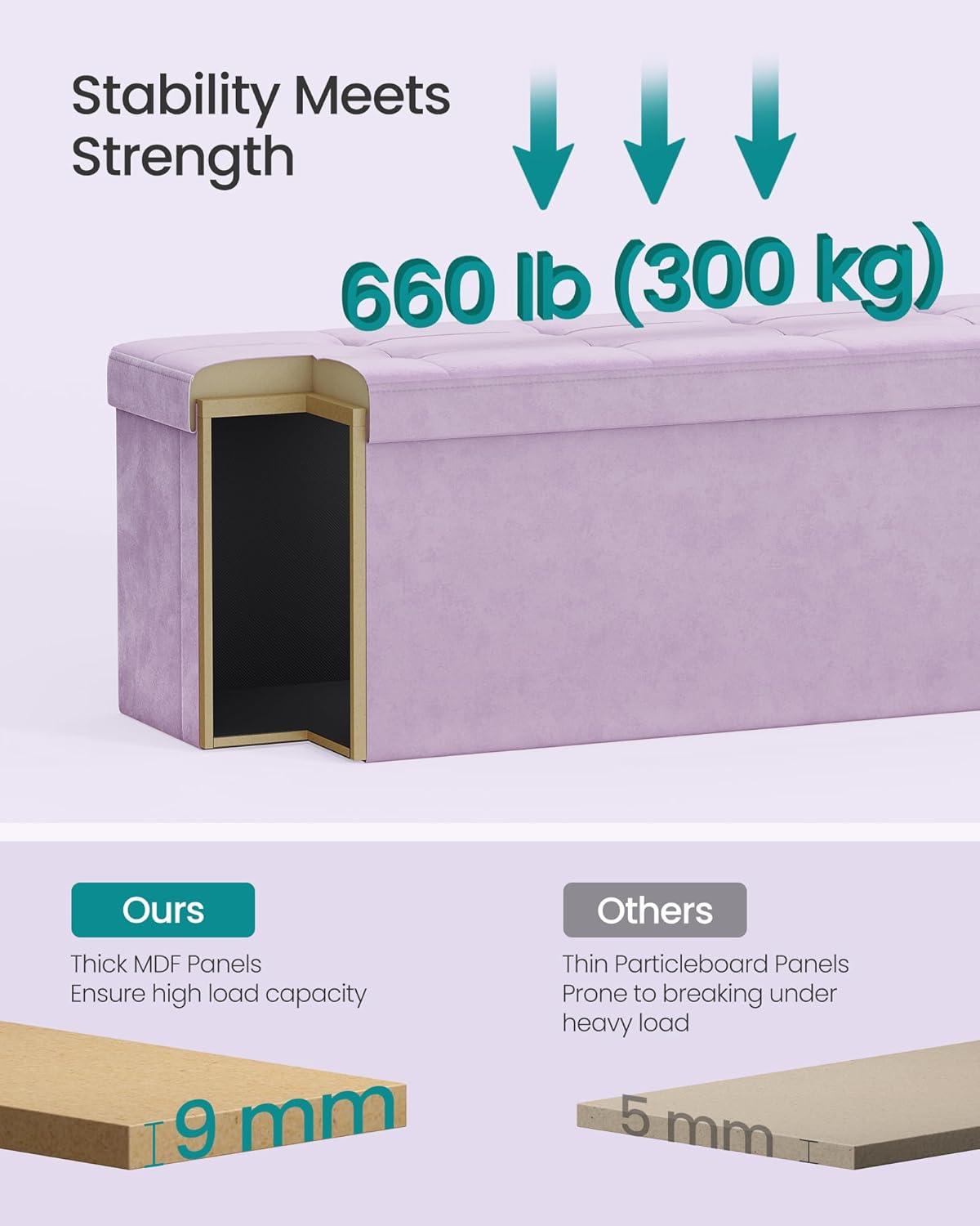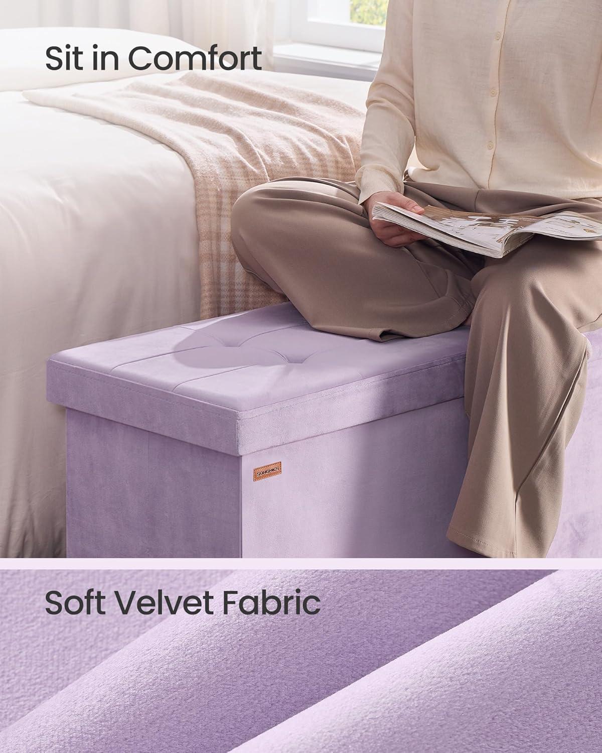 SONGMICS Mazie Collection - Storage Ottoman Bench, Foldable Foot Rest, 15 x 43 x 15 Inches, End of Bed Bench, Storage Chest, Load 660 lb, Living Room, Bedroom, Entryway, Jelly Pink ULSF277R01(Light Lilac)