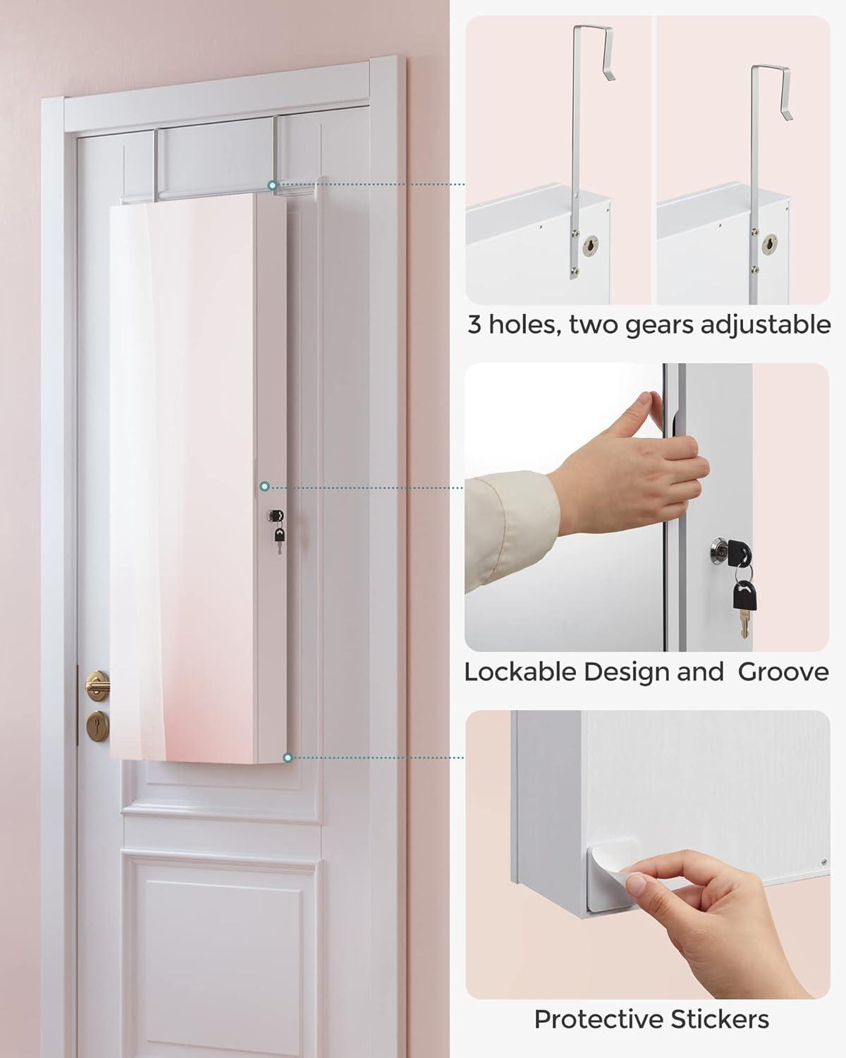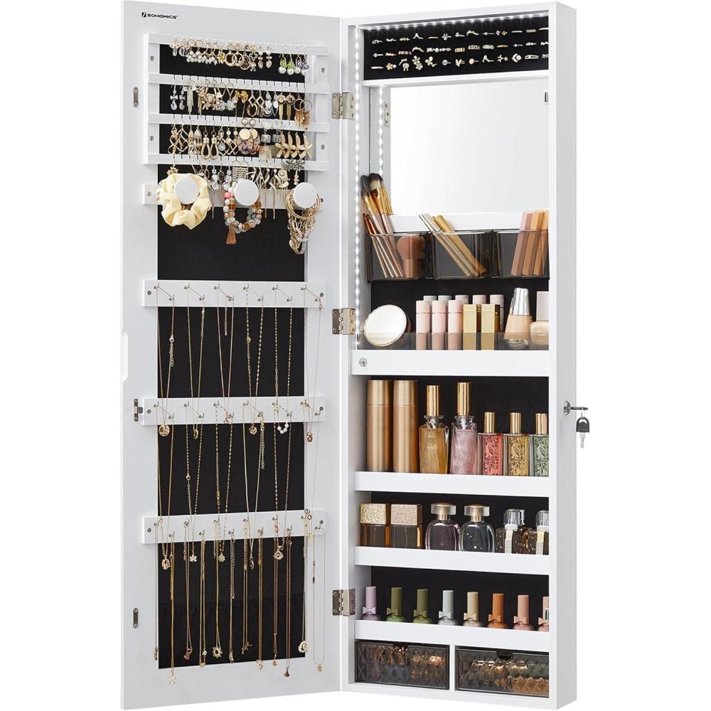 imageSONGMICS Mirror Jewelry Cabinet Armoire Organizer Wall or Door Mount Storage Cabinet with FullLength Frameless Lighted Mirror Builtin Makeup Mirror 2 Drawers Lockable White UJJC013W01White