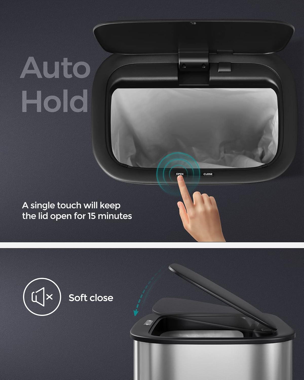 [Closes Softly & Stays Open] This kitchen trash can has a smooth, slow, and silent close lid. The lid can stay open for 15 minutes by touching the “OPEN” button when you do large clean-ups