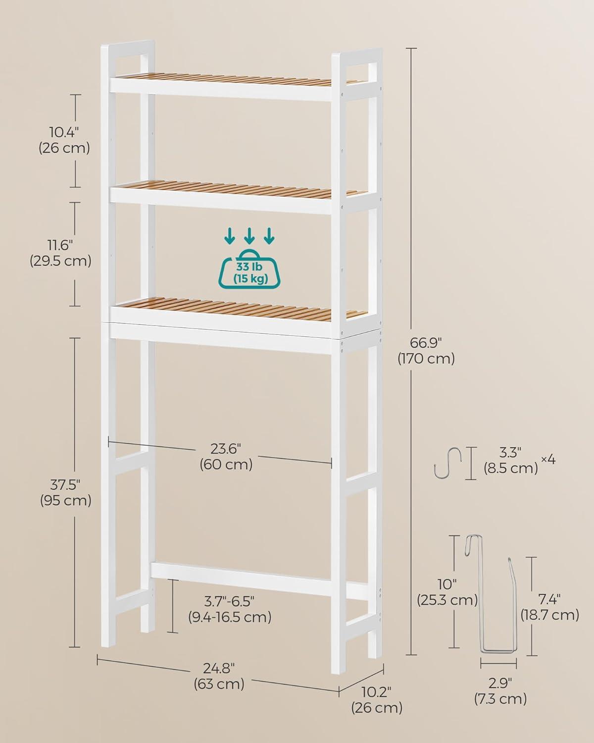 Spacious Bottom Space: With a large bottom space of 10″D x 23.6″W x 37.5″H, this over-the-toilet shelf can be placed over a washing machine or a trash can. It's recommended to leave 0.5″ space on both sides and above to avoid scratches