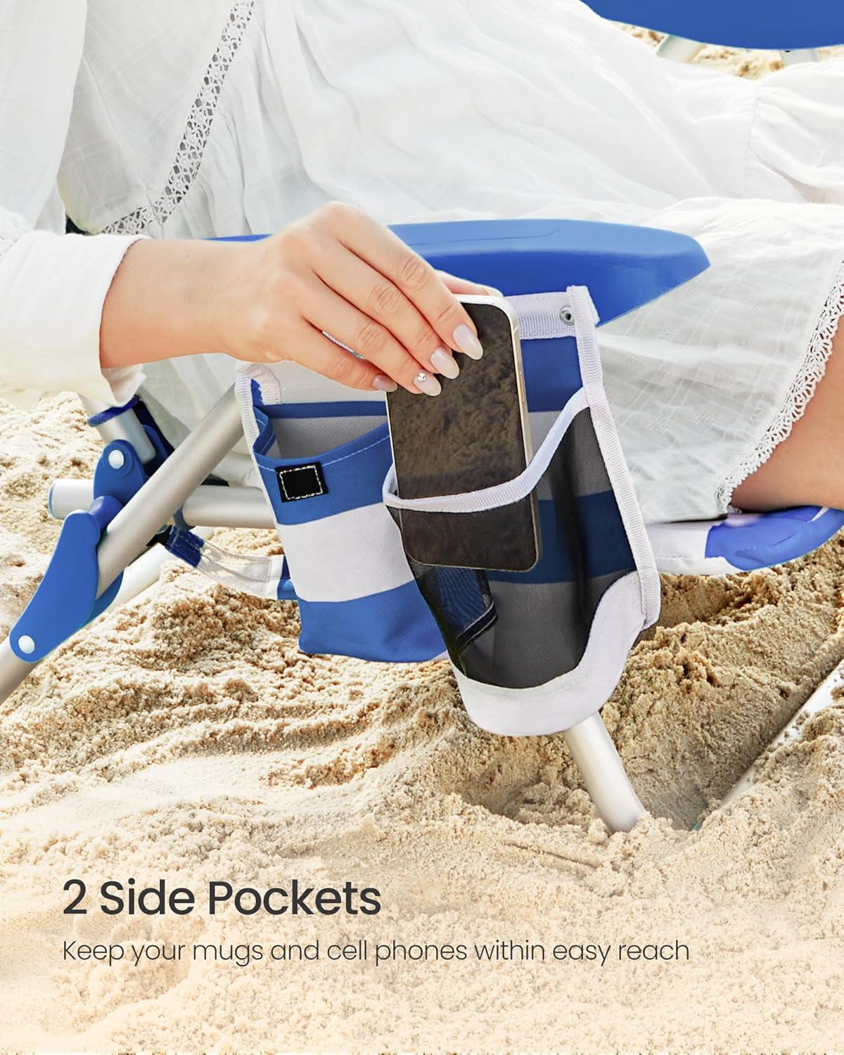 【EASY TO USE】No assembly needed. Just unfold the beach chair, and then it's ready for use; you can put your drinks in the mesh pocket, and put your phones and napkins in the fabric pocket
