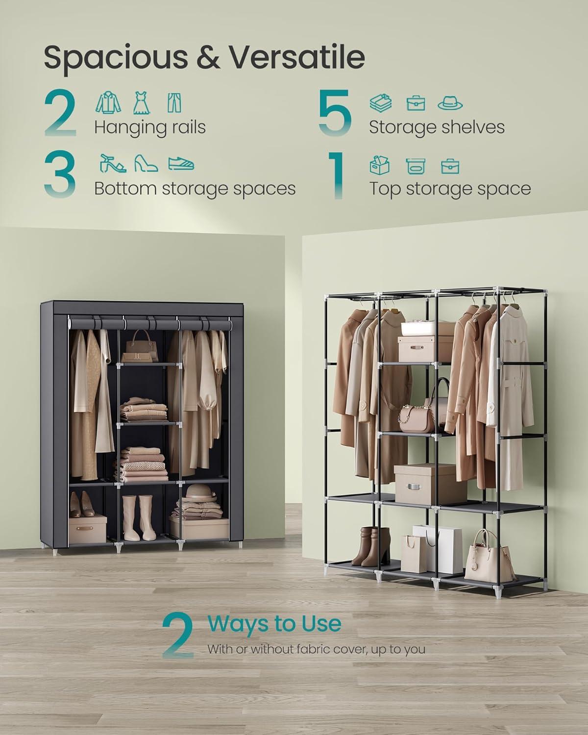 SONGMICS Portable Closet, 51.2 Inch Large Capacity Wardrobe Closet Organizer with Fabric Cover, Hanging Rods and Shelves, 51.2 x 17.7 x 66.1 Inches, for Bedroom, Living Room, Dove Grey URYG096G01(Black)