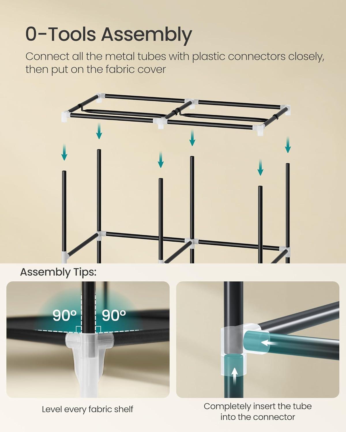 [Assembly Is a Breeze] Just join all the metal tubes with plastic connectors, slip the fabric cover on, and you’ll set up this portable closet in no time—no screws, no tools, no trouble!