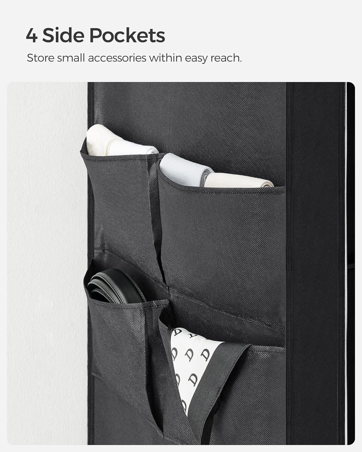 [4 Side Pockets] This fabric wardrobe comes with 4 storage pockets on one side for storing small items such as socks, keys, and gloves. You won't have to rummage around searching for your small things when you’re in a hurry to go out