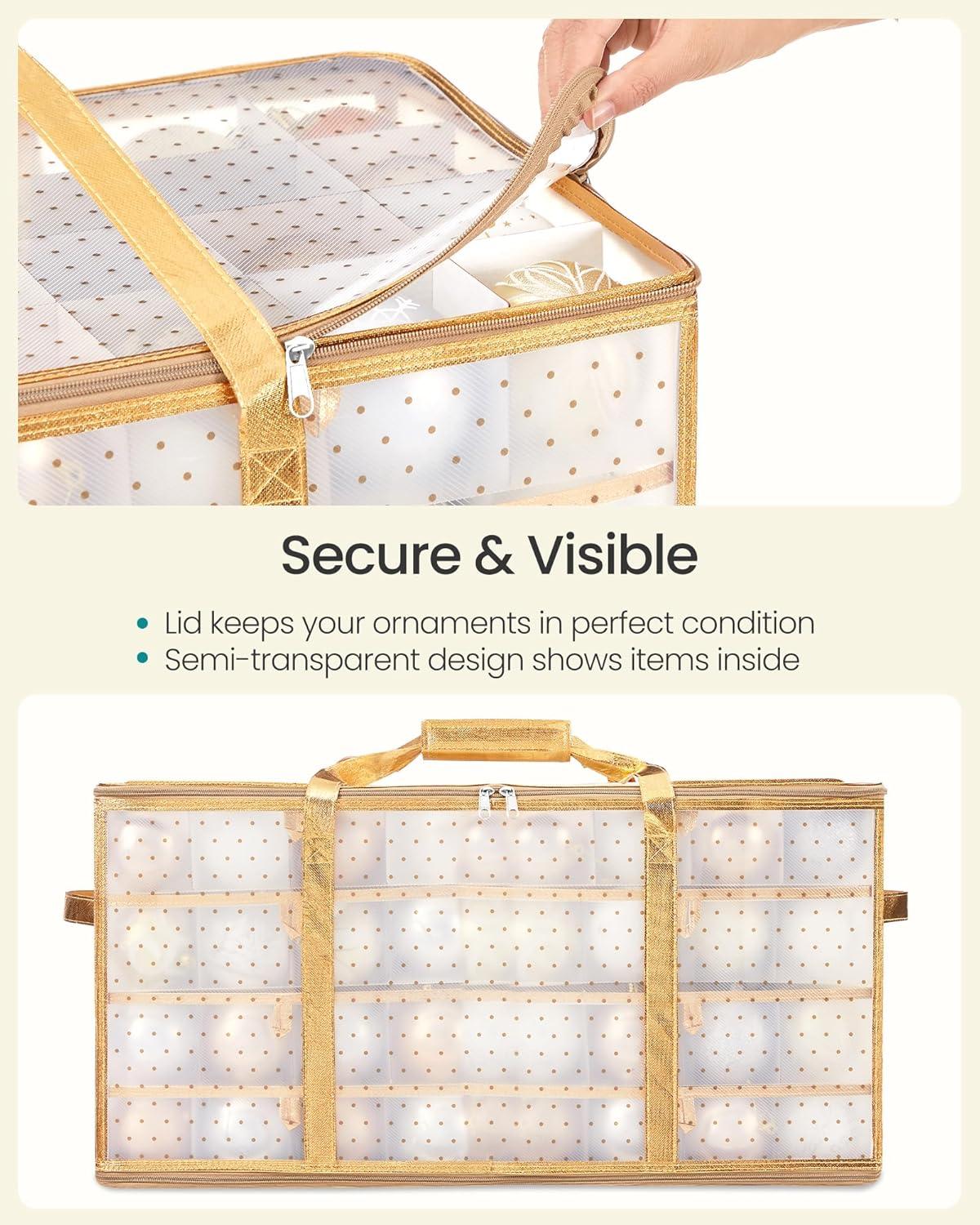 SONGMICS Set of 2 Large Christmas Ornament Storage Boxes, 16 Trays, Hold 256 Balls up to 3-Inch, Plastic Christmas Storage Containers with Lids, Dual Zippers, Side Handles Sandy Gold URFB029A07(Sandy Gold)