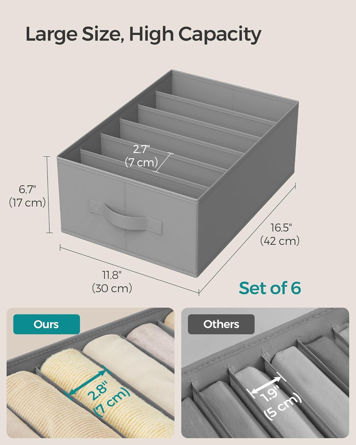 [Roomy Compartments] Each wardrobe organizer, with dimensions of 16.5″D x 11.8″W x 6.7″H (42 x 30 x 17 cm), provides 6 compartments. These compartments, each measuring 2.8″ (7 cm) in width, offer ample space for jeans, sweaters, and more