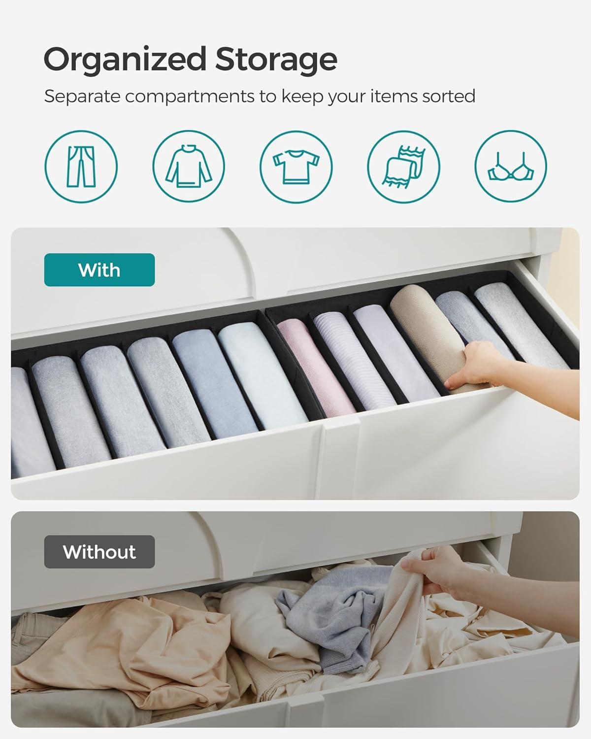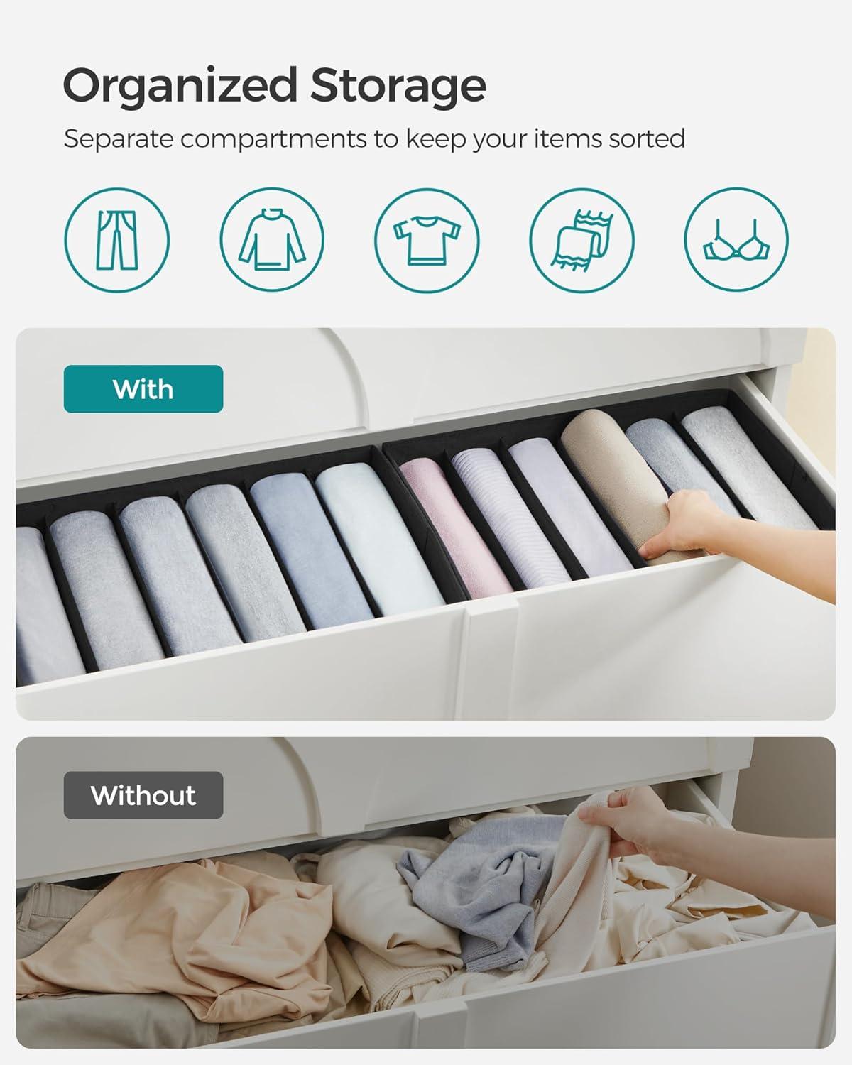 [Roomy Compartments] Each wardrobe organizer, with dimensions of 16.5″D x 11.8″W x 6.7″H (42 x 30 x 17 cm), provides 6 compartments. These compartments, each measuring 2.8″ (7 cm) in width, offer ample space for jeans, sweaters, and more