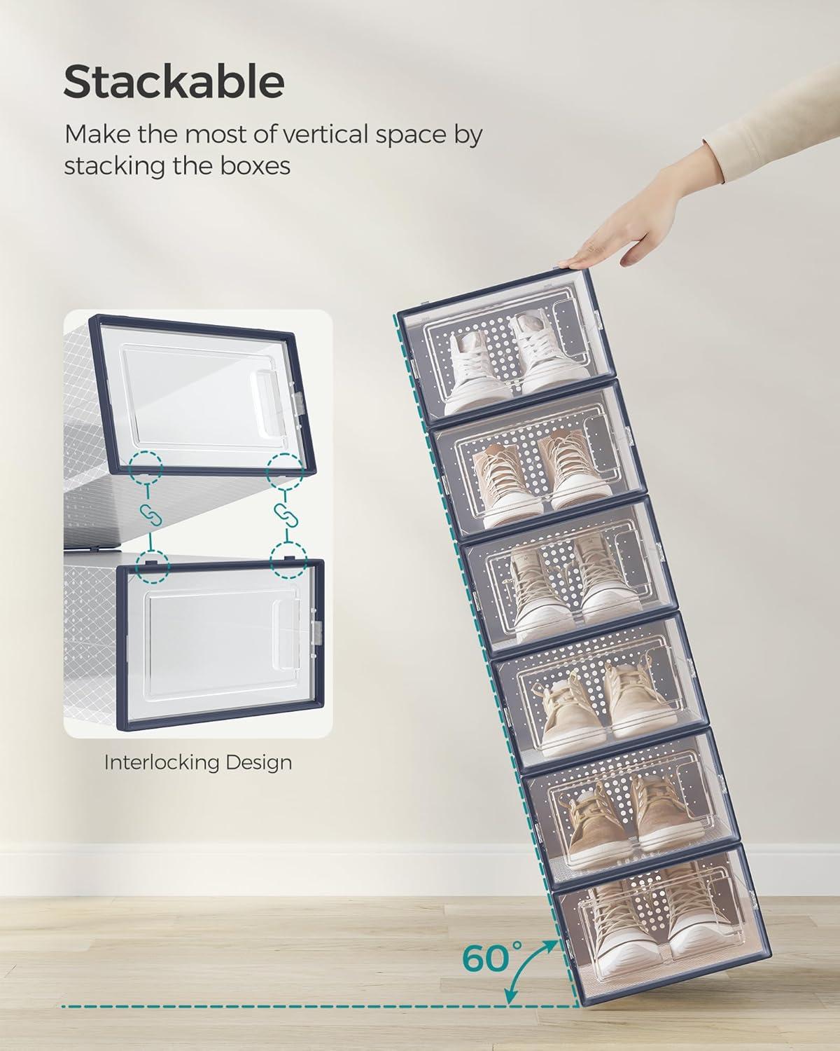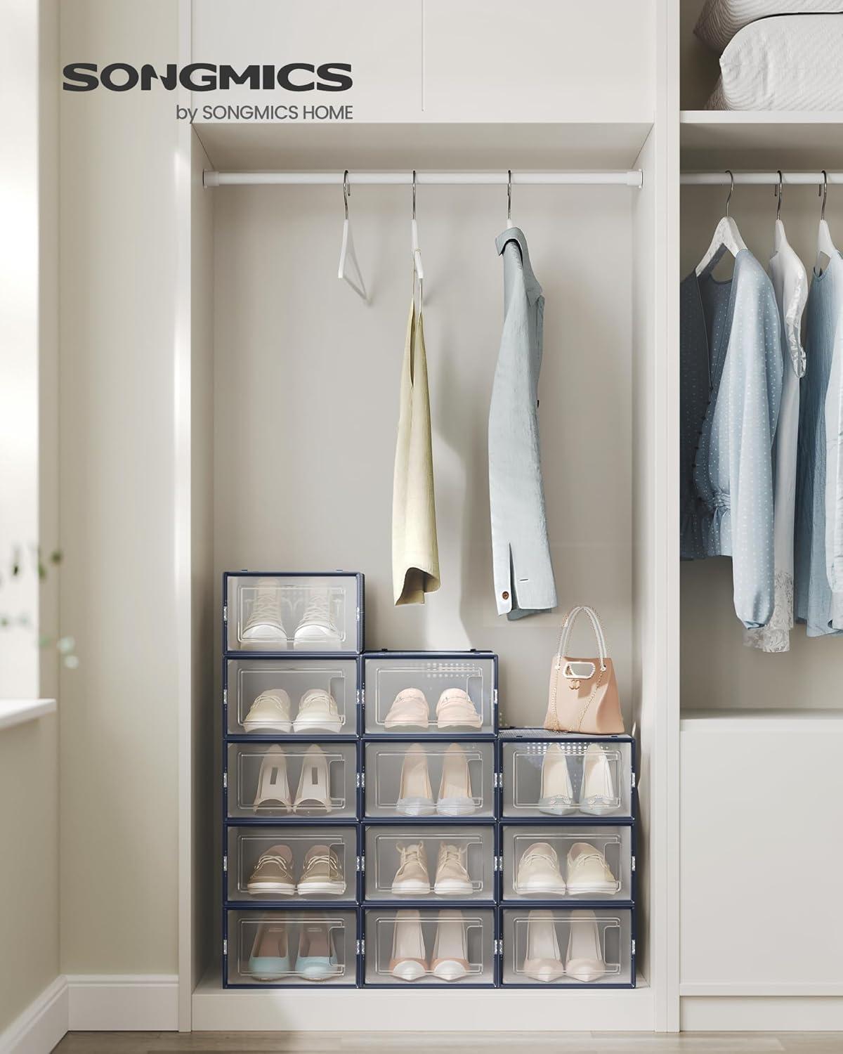 SONGMICS Shoe Boxes, Pack of 12 Shoe Storage Organizers, Stackable Clear Plastic Boxes for Closet, Sneakers, 13.1 x 9.1 x 5.6 Inches, Transparent and White ULSP12SWT(Transparent + Charcoal Blue)