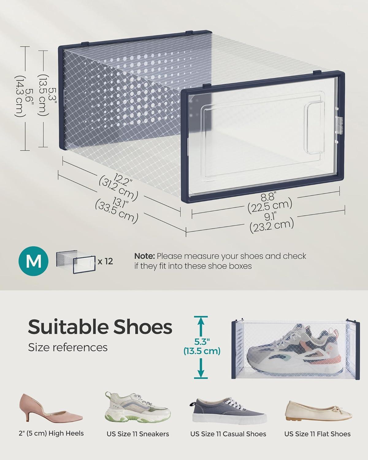 Compatible Shoe Sizes: This set of 12 foldable shoe boxes has inner dimensions of 12.2″L x 8.8″W x 5.3″H, fitting up to US size 11 for women’s shoes or size 9 for men’s shoes