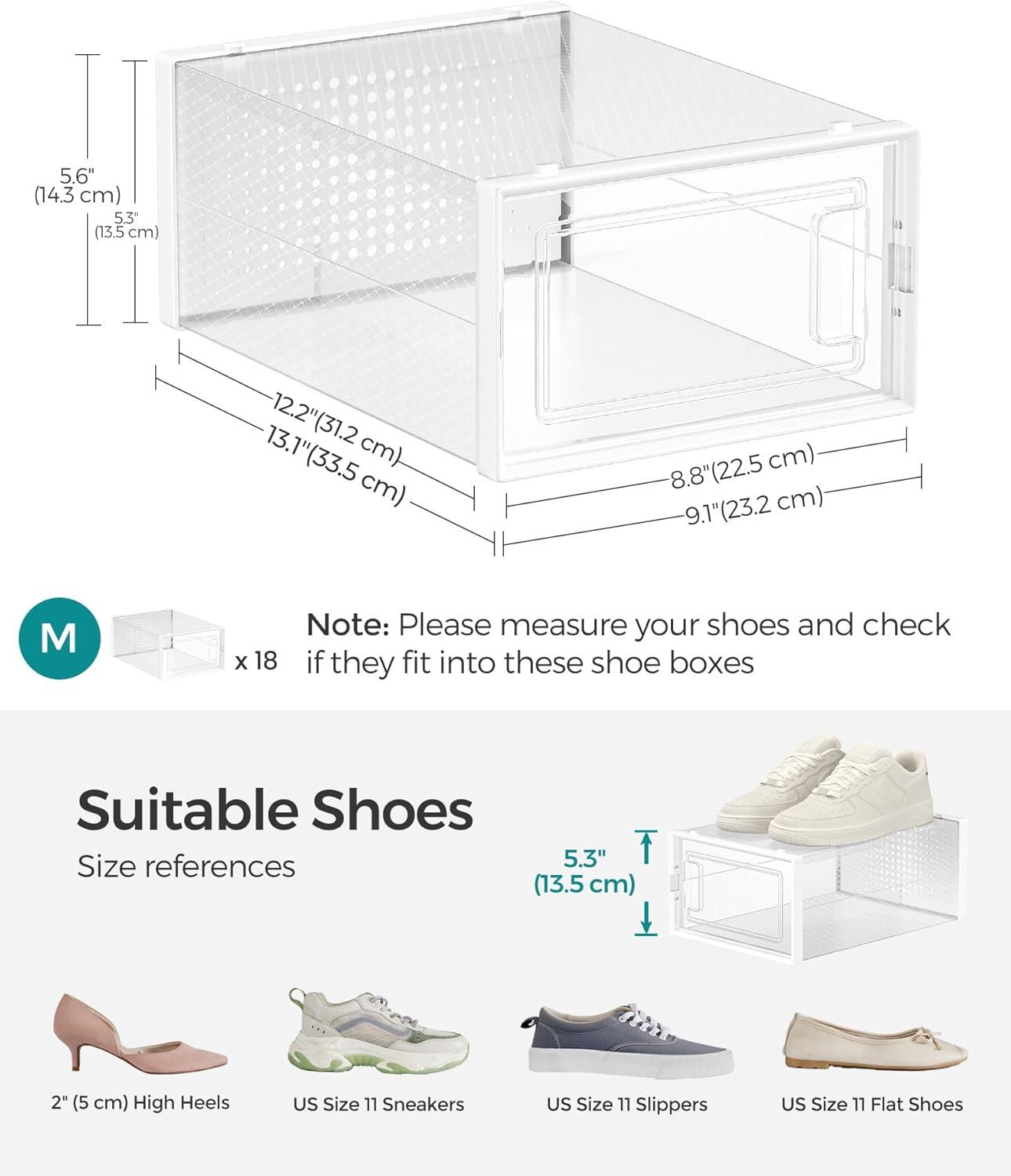 Compatible Shoe Sizes: This set of 12 foldable shoe boxes has inner dimensions of 12.2″L x 8.8″W x 5.3″H, fitting up to US size 11 for women’s shoes or size 9 for men’s shoes