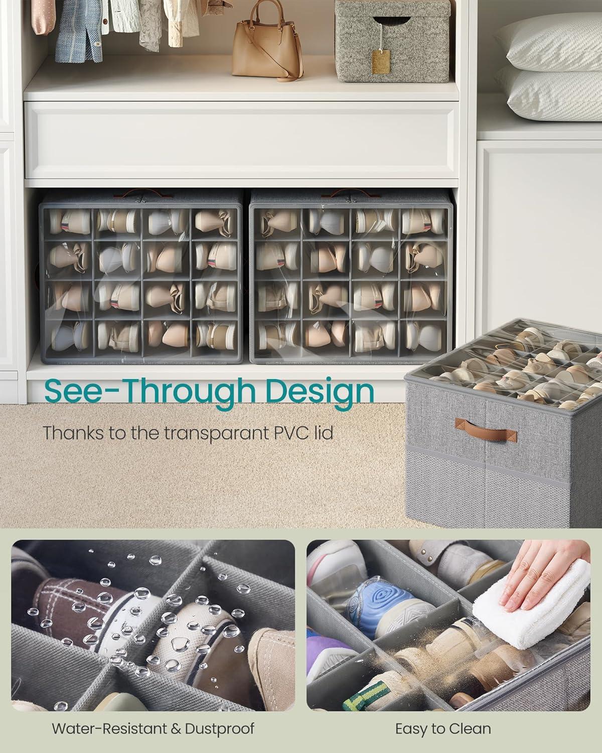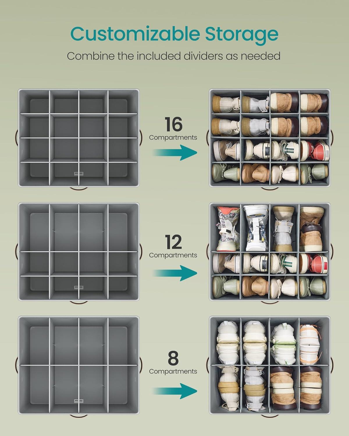 Customisable: Flexible dividers allow compartments to adjust according to shoe size. These storage boxes can hold shoes, clothes, and bags of different sizes