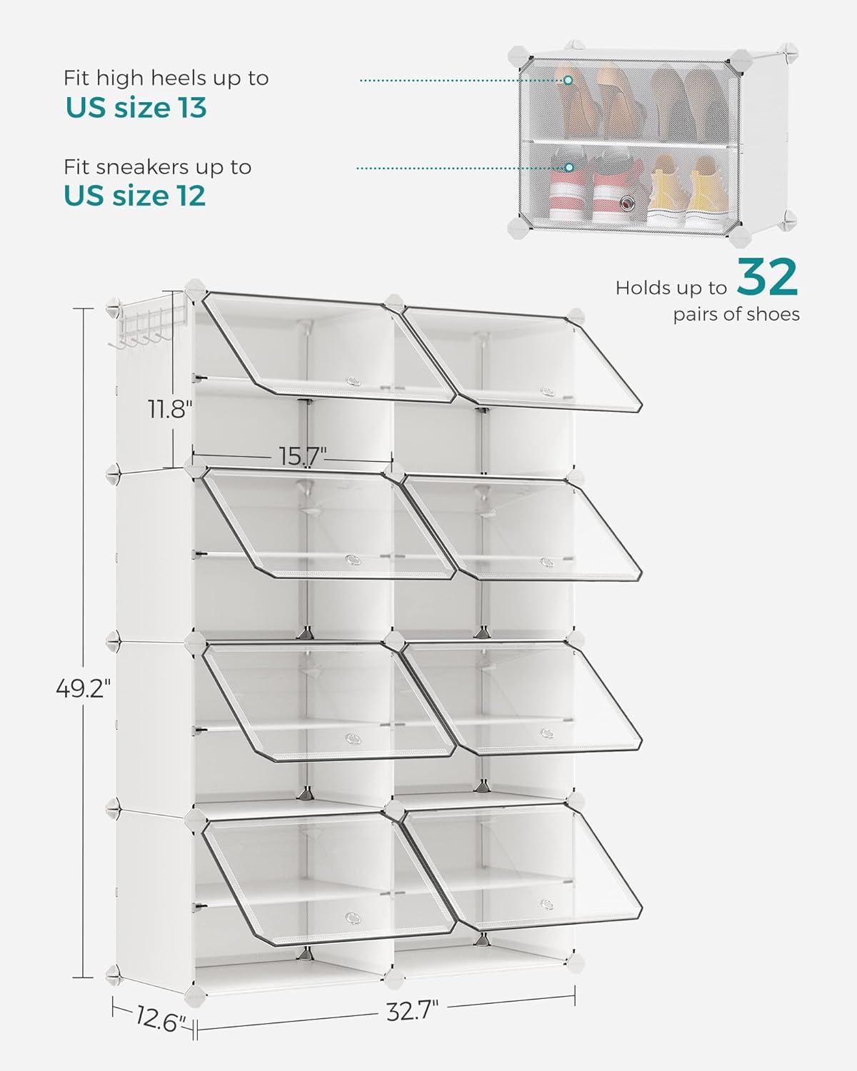 SONGMICS Shoe Rack Organizer, 8-Tier Shoe Storage Cabinet for Closet and Entryway, Holds 32 Pairs of Shoes, Adjustable, Cloud White and Trasparent ULPC034W01(Cloud White + Trasparent)