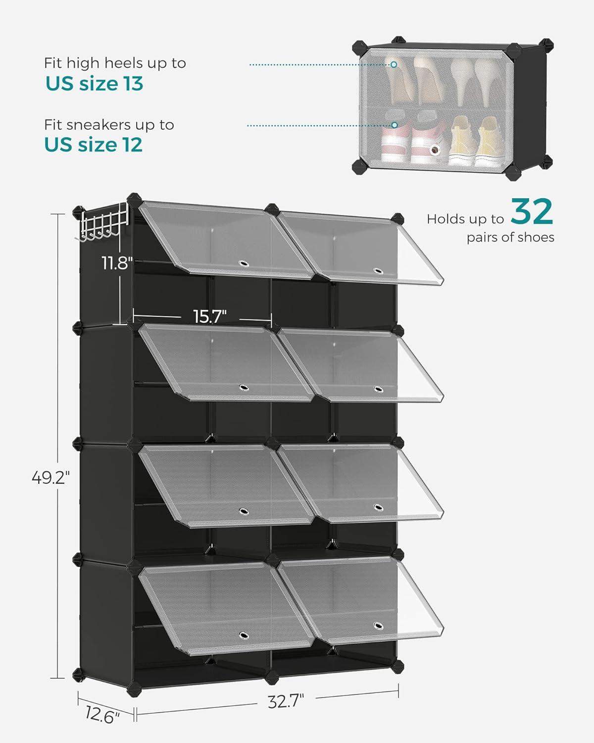 SONGMICS Shoe Rack Organizer, 8-Tier Shoe Storage Cabinet for Closet and Entryway, Holds 32 Pairs of Shoes, Adjustable, Cloud White and Trasparent ULPC034W01(Ink Black + Trasparent)