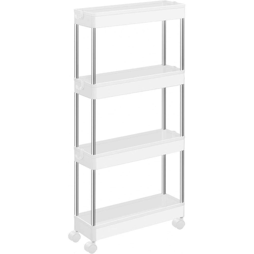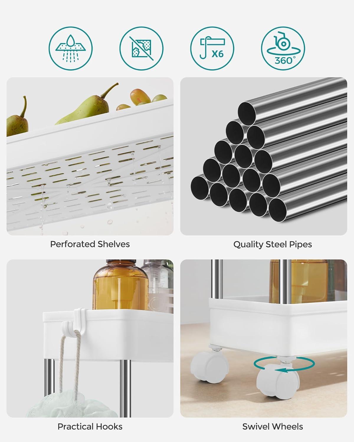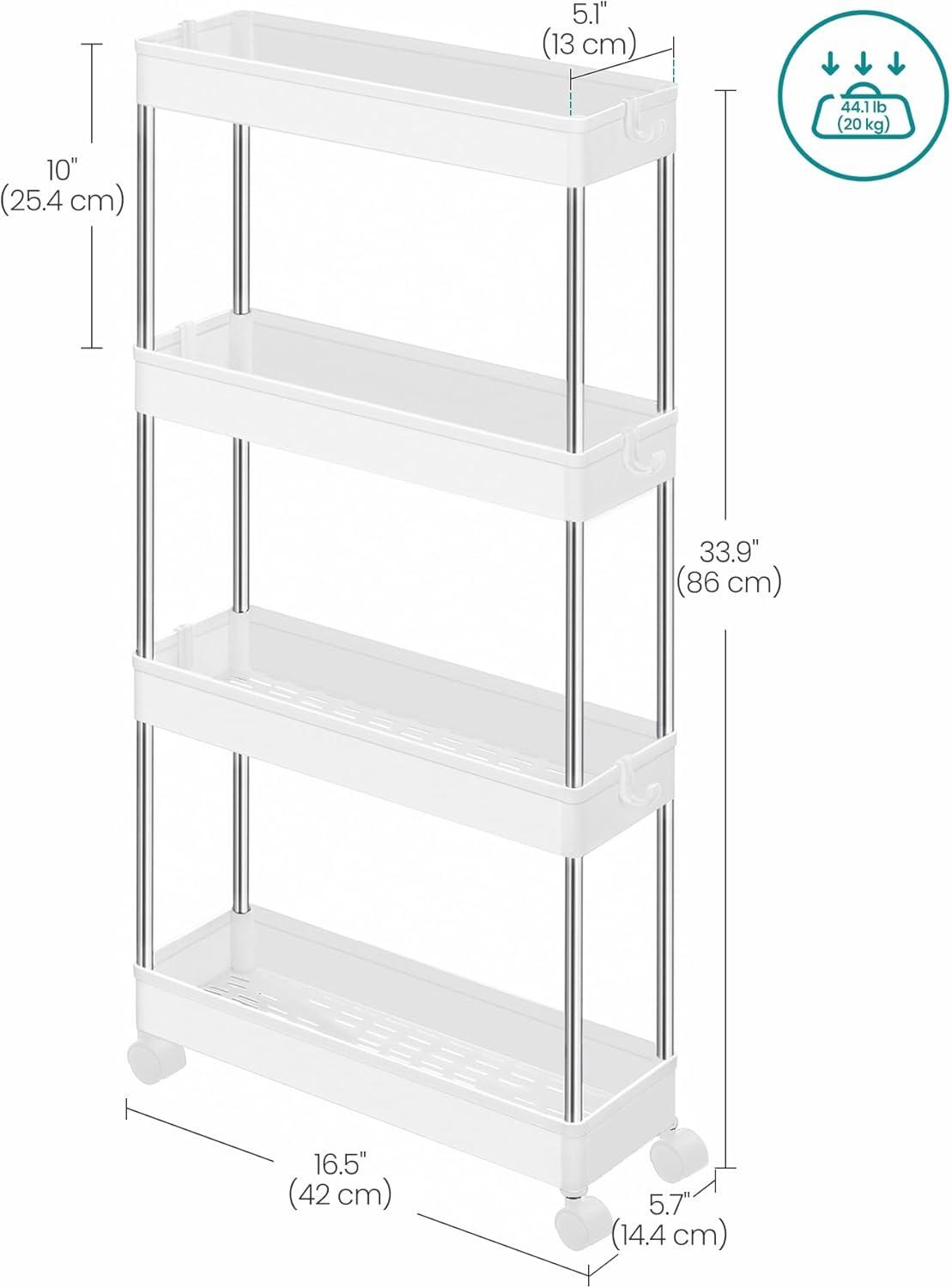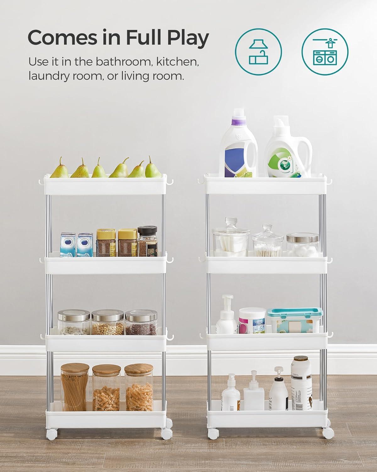SONGMICS Slim Storage Cart, 4-Tier Rolling Cart, Narrow Utility Cart on Wheels, 6 Hooks, 360° Swivel Wheels, Lockable, Steel Frame, Bathroom, Kitchen, Office, Dove Gray UKSC008G01(Cloud White)