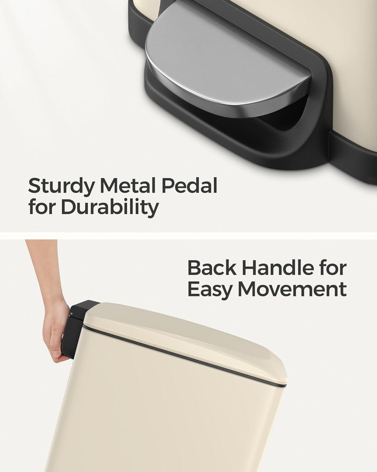 [Thoughtful Detailing] The metal pedal is sturdy for lasting use. The handle on the back allows for easy movement. Included are 15 liner bags that perfectly fit this slim kitchen can