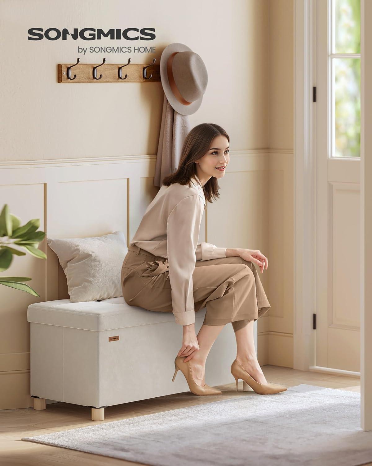 SONGMICS Storage Ottoman Bench, Folding Storage Chest, 15 x 30 x 15.2 Inches, Foot Rest Stool, 20 Gal. (77 L), Velvet Surface, for Bedroom, Entryway, Living Room, Jelly Pink ULSF0517R01(Cream White)