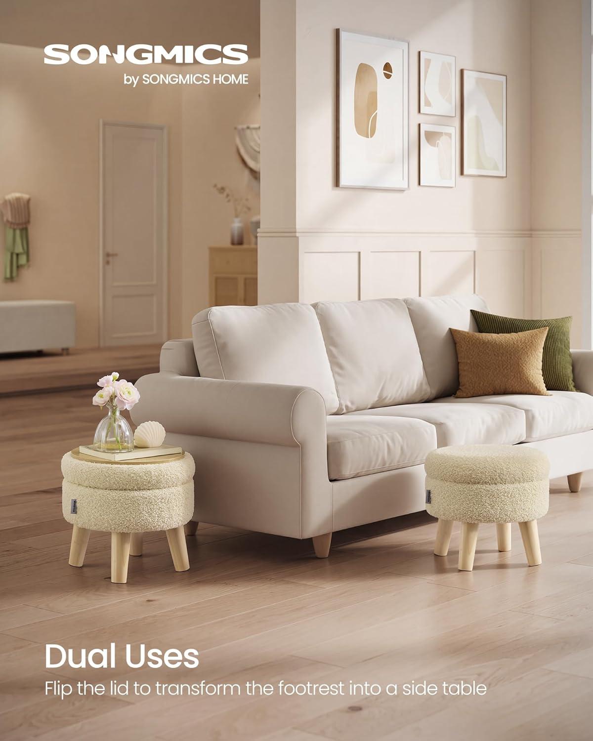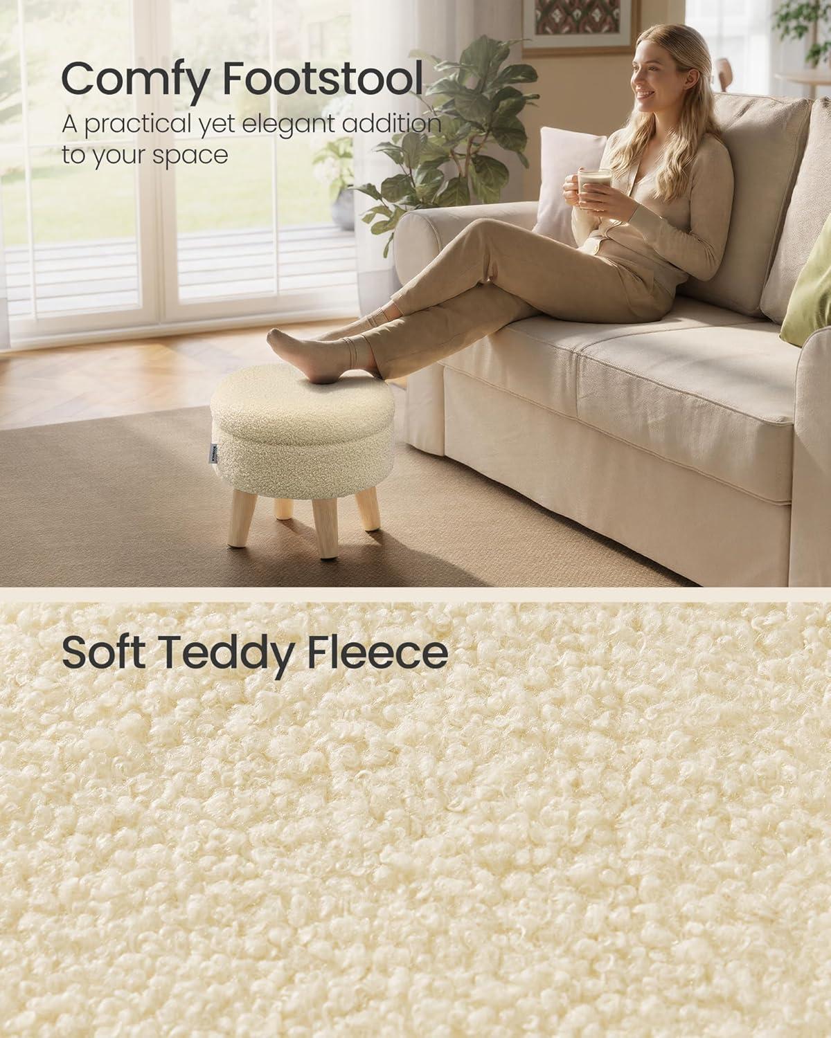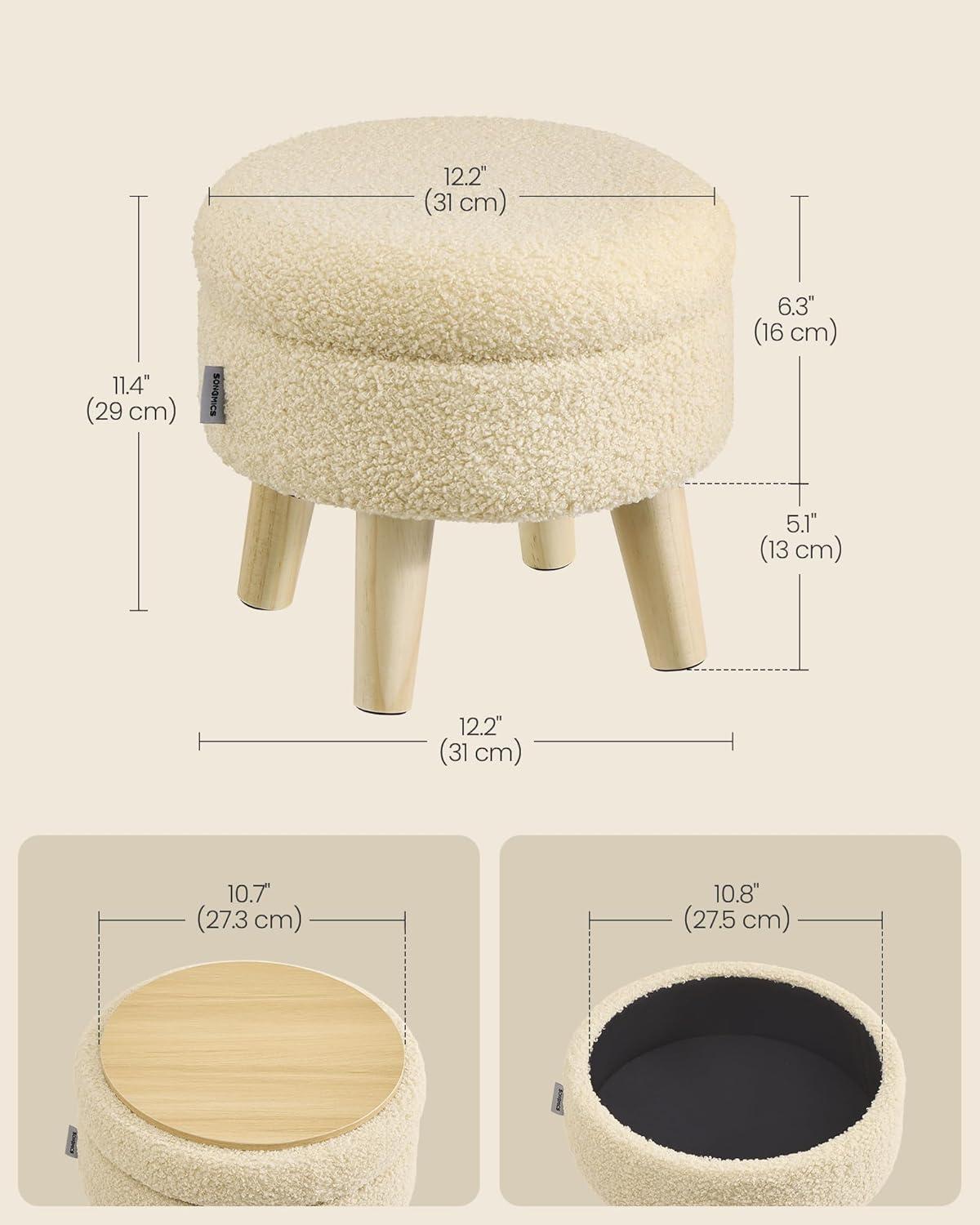 SONGMICS Storage Ottoman, Foot Stool, Round Ottoman with Padded Seat, Foot Rest with Wood Legs, Small Table, for Hallway, Living Room, 12.2 Inches, Velvet, Cream White ULOM513LH01(White)