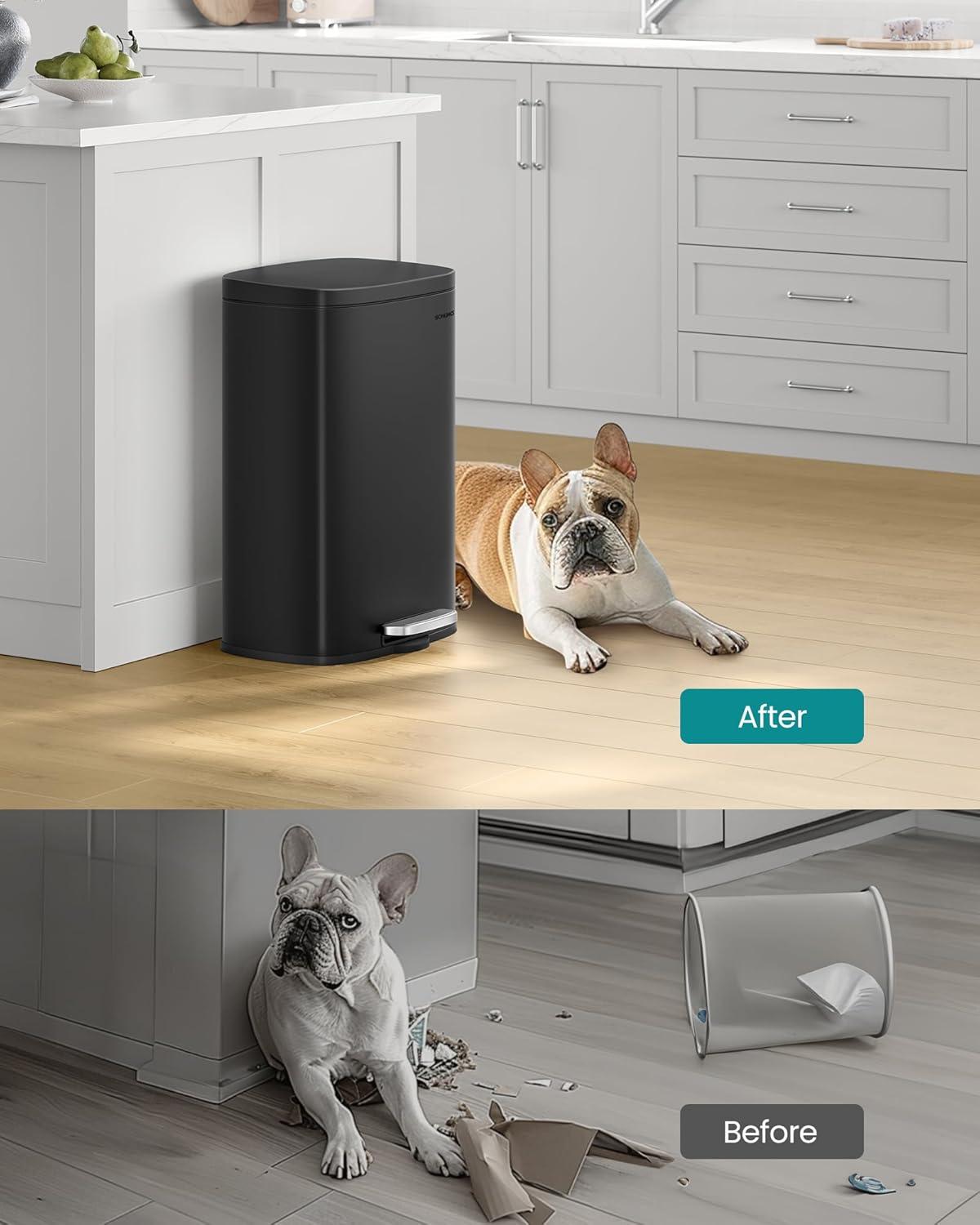 [Soft-Close, Odor-Sealing Lid] This kitchen trash can features a slow and quiet soft close lid. The tight seal of the lid prevents lingering odors