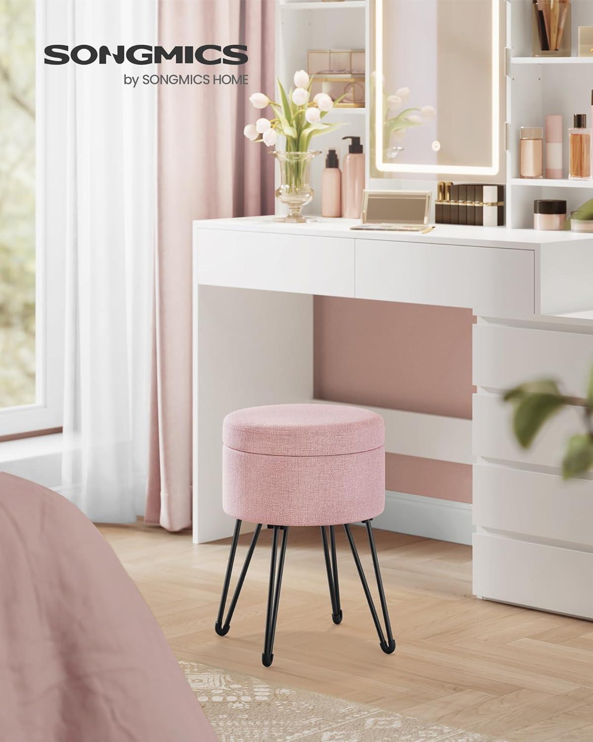 SONGMICS Vanity Stool Chair, Small Ottoman Stool with Storage, Vanity Chair, 15.4 Dia. x 17.4 Inches, 4 Metal Legs, for Makeup Room, for Living Room, Bedroom, Cream White ULOM002W01(Jelly Pink)