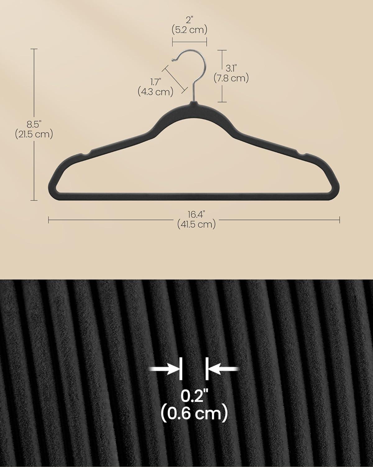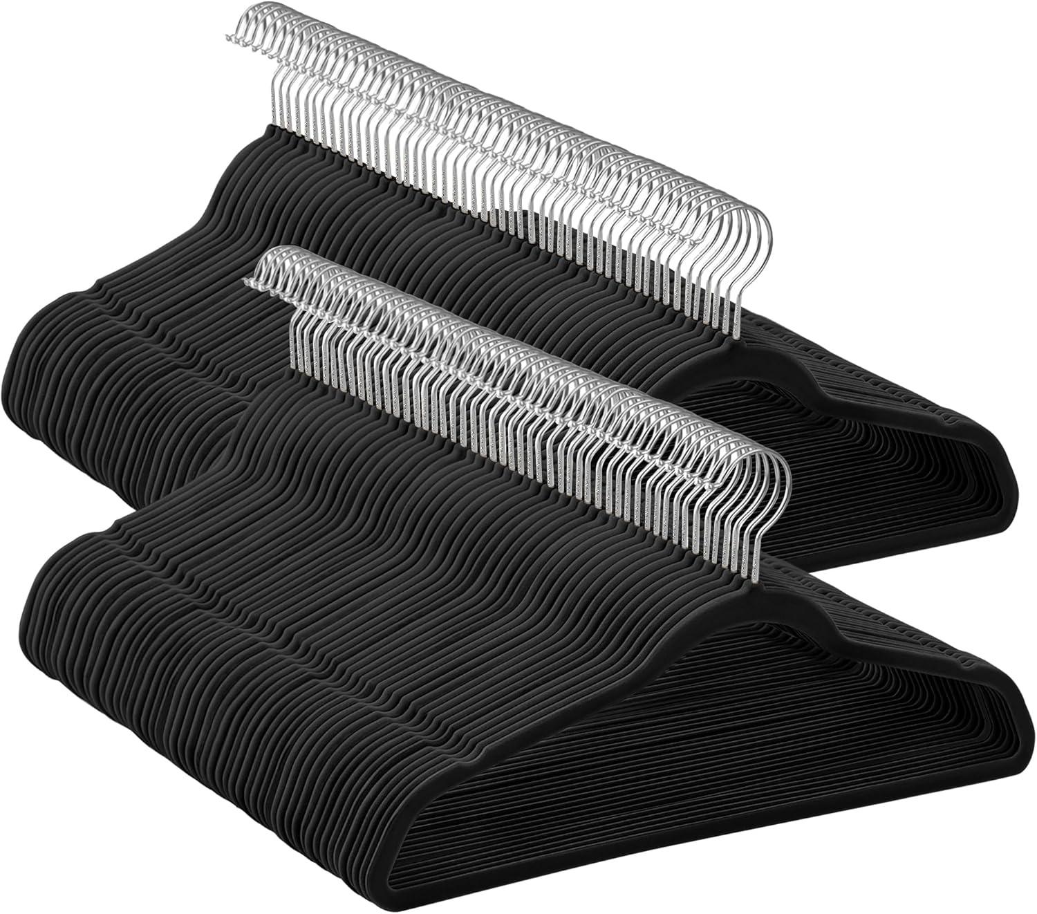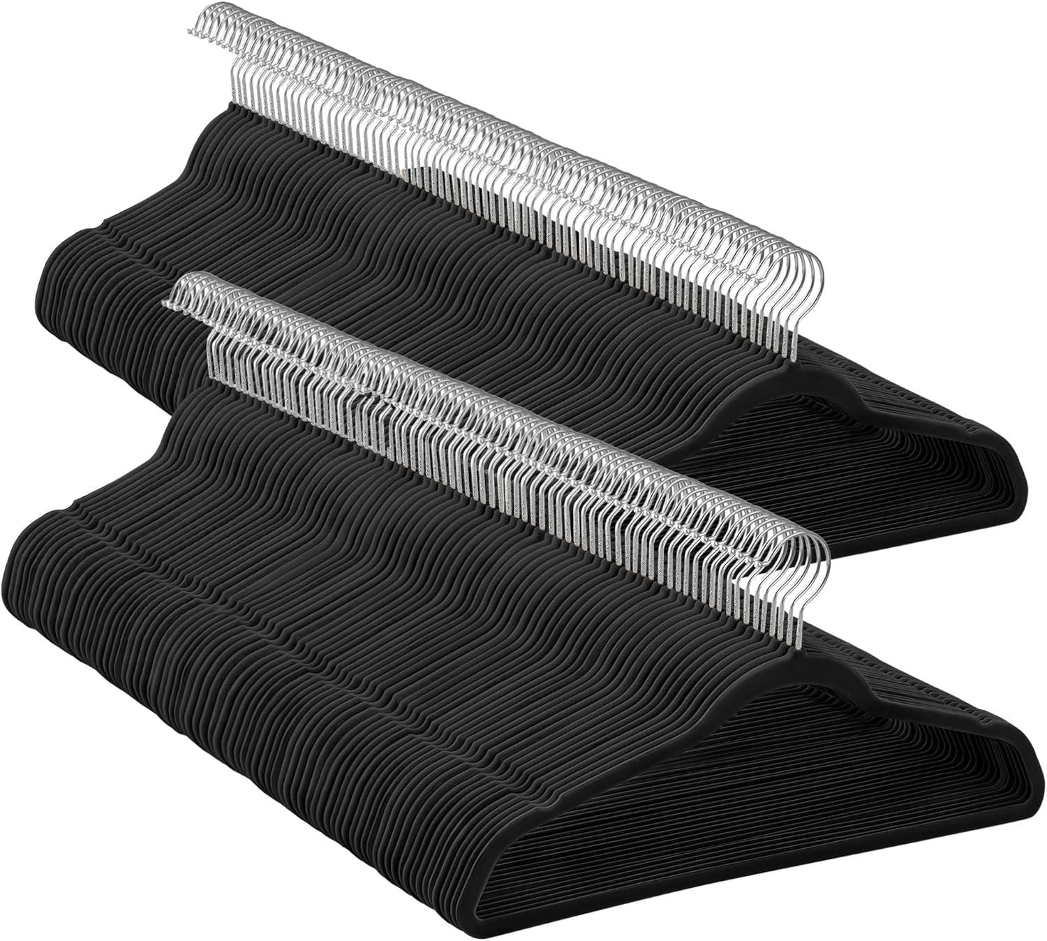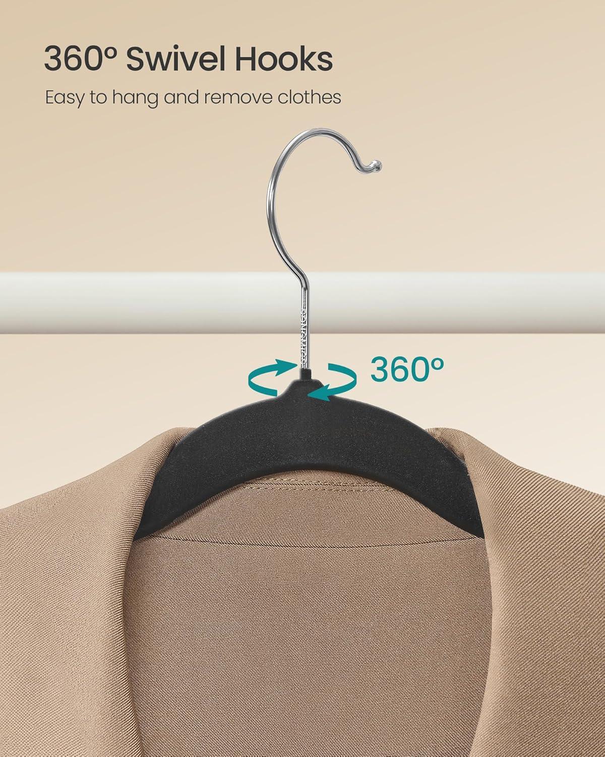 What You Get: A set of 150 SONGMICS velvet hangers with 360° swivel silver-colored hooks, shoulder grooves, and a maximum load capacity of 11 lb (5 kg) each for an organized closet