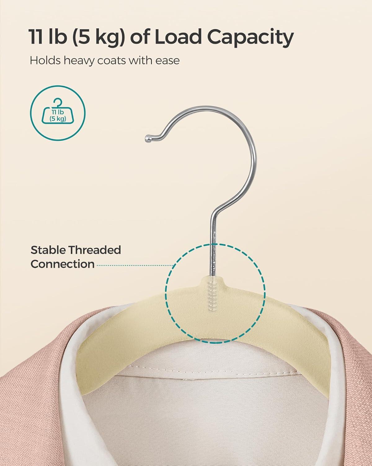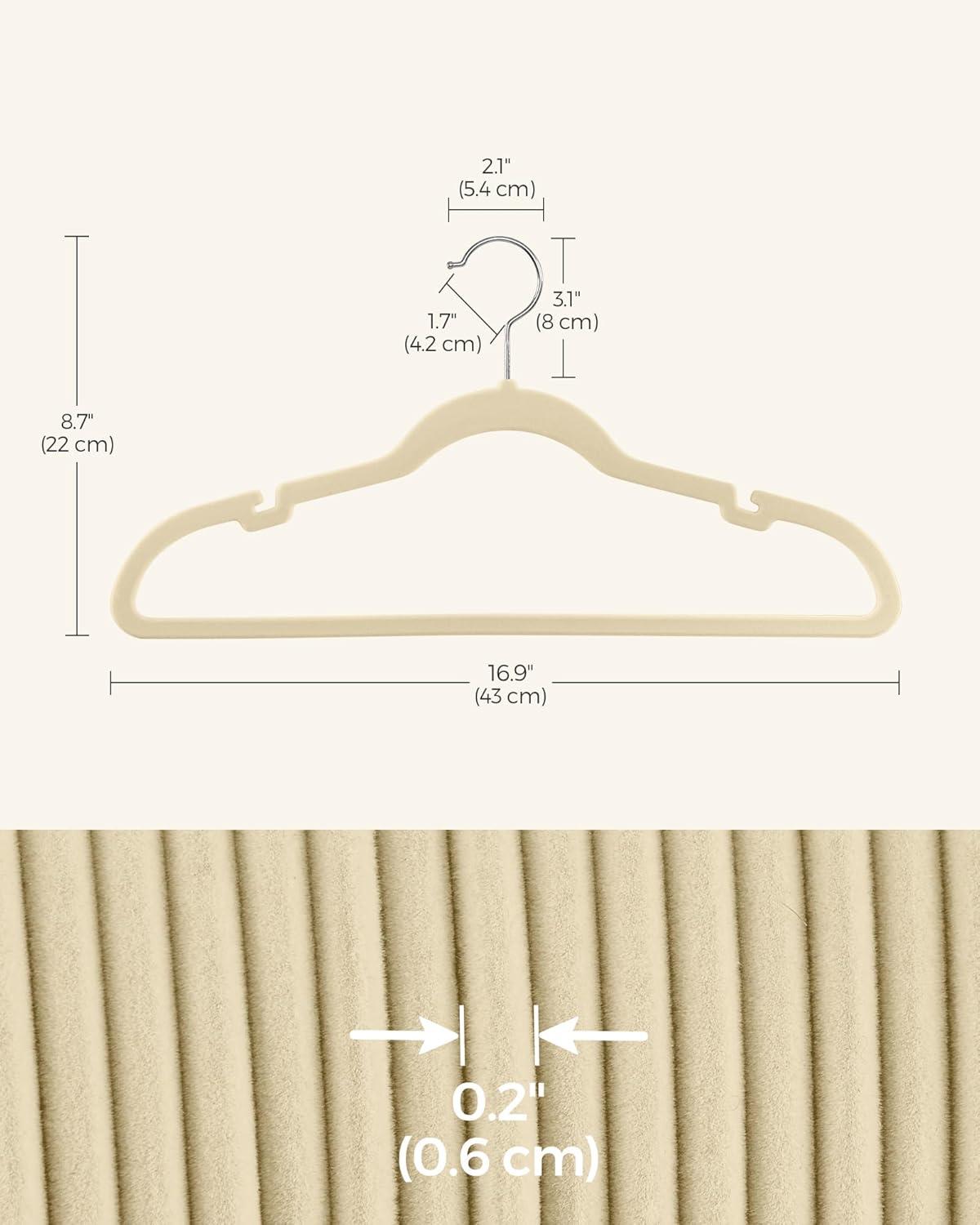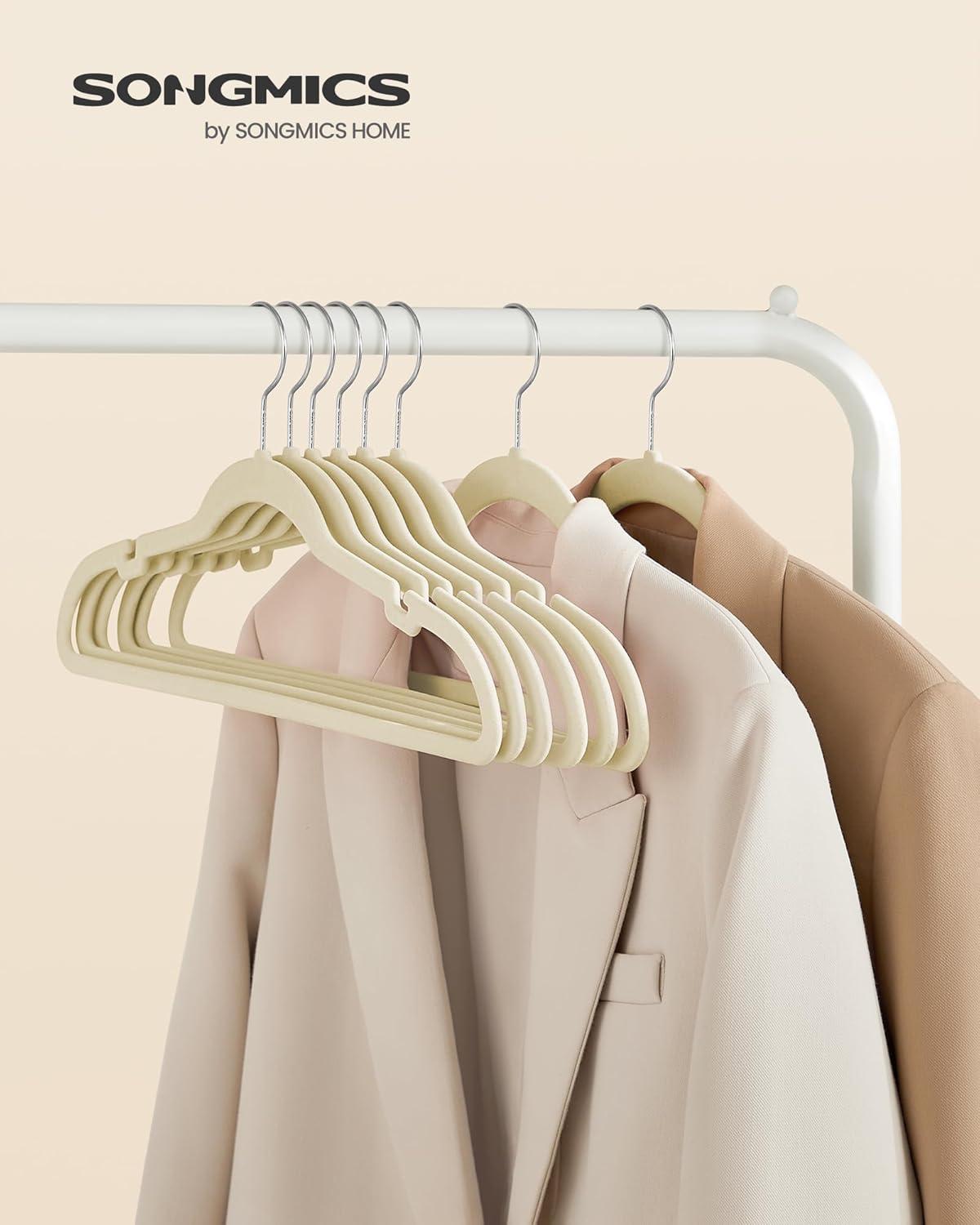 SONGMICS Velvet Hangers 50 Pack, Non-Slip Clothes Hangers, with Shoulder Notches, Pants Bar, 360° Swivel Hook, Space-Saving, for Closet, Ink Black UCRF029B05(Sand Beige)