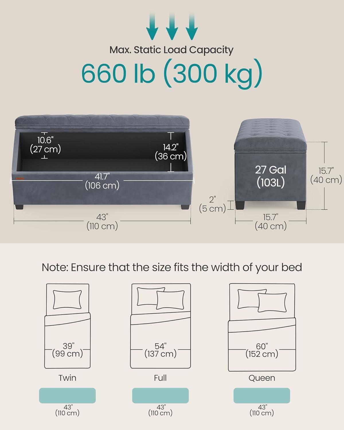 【SPACIOUS STORAGE】Sized at 15.7″D x 43″W x 15.7″H (40 x 110 x 40 cm), this bench offers a 27-gallon (103 L) volume for your blankets, books, and bed sheets