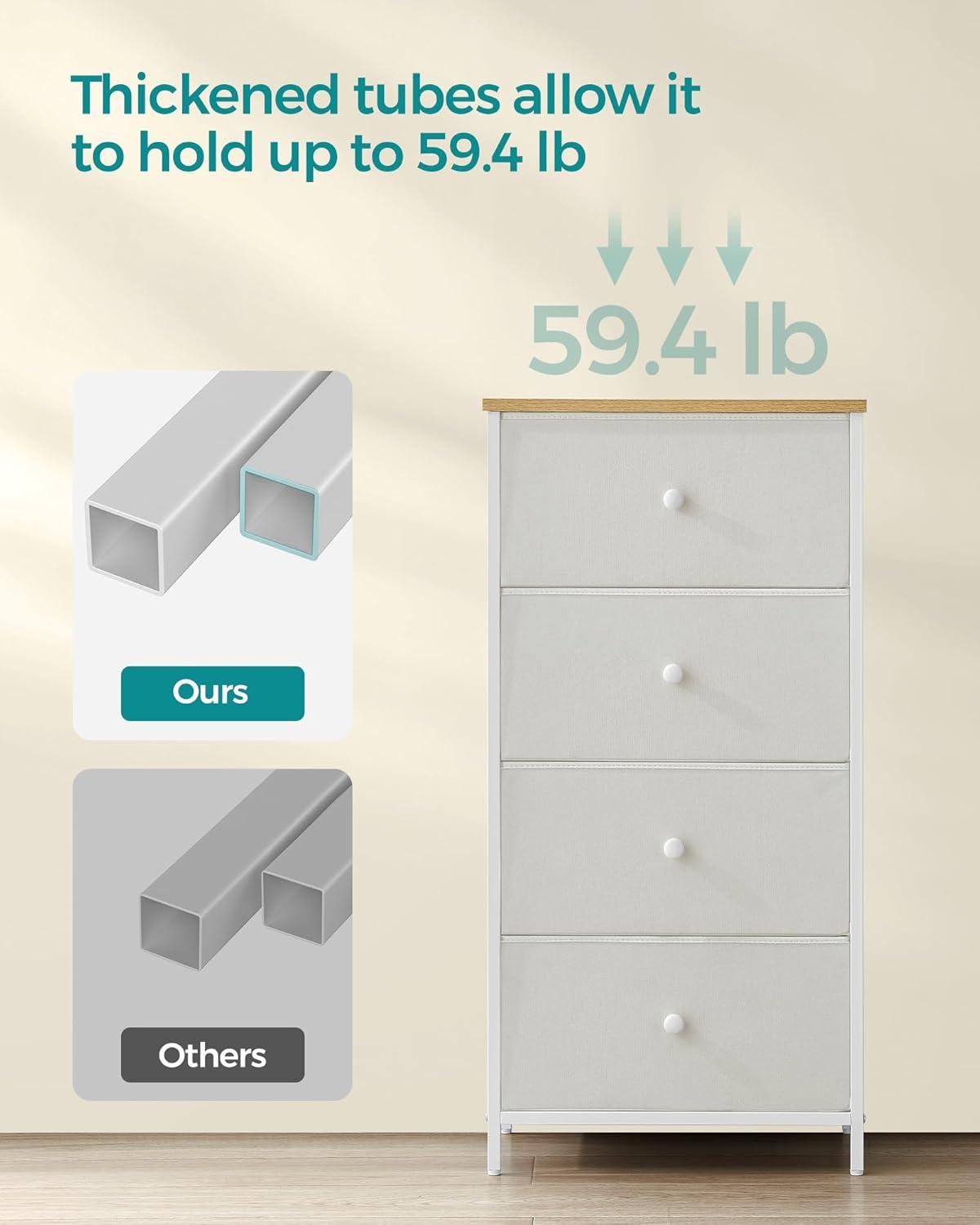 Teamwork Works: A metal frame for sturdiness, fabric drawers for a lightweight design, and wooden top and drawer front to soften the coolness—this trio of materials brings the strength into full play, offering a stable yet easy-to-move drawer dresser