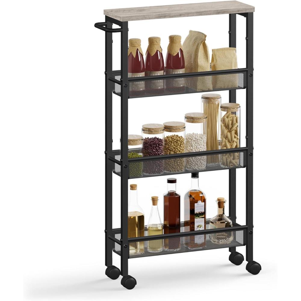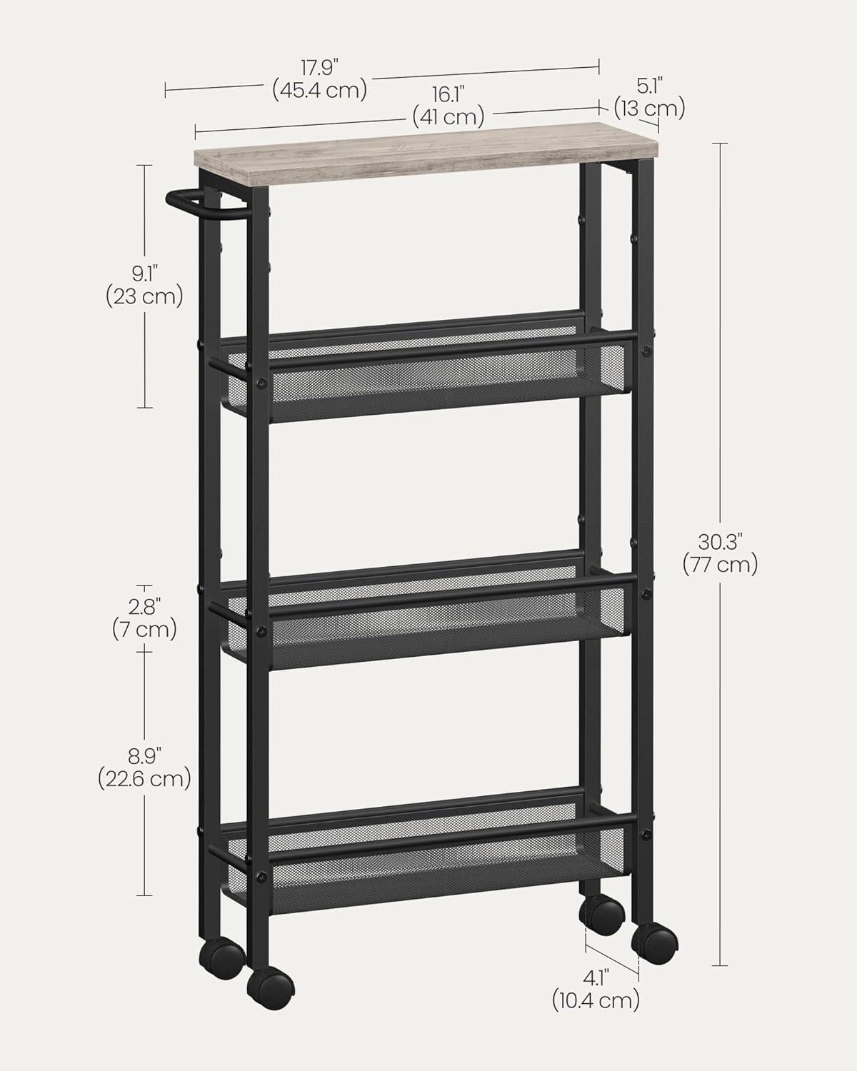 【DELIGHTS NARROW SPACES】This slim rolling cart, sized at 8.7″D x 17.9″W x 30.3″H, easily fits the narrow gap between your kitchen counter and refrigerator for added storage