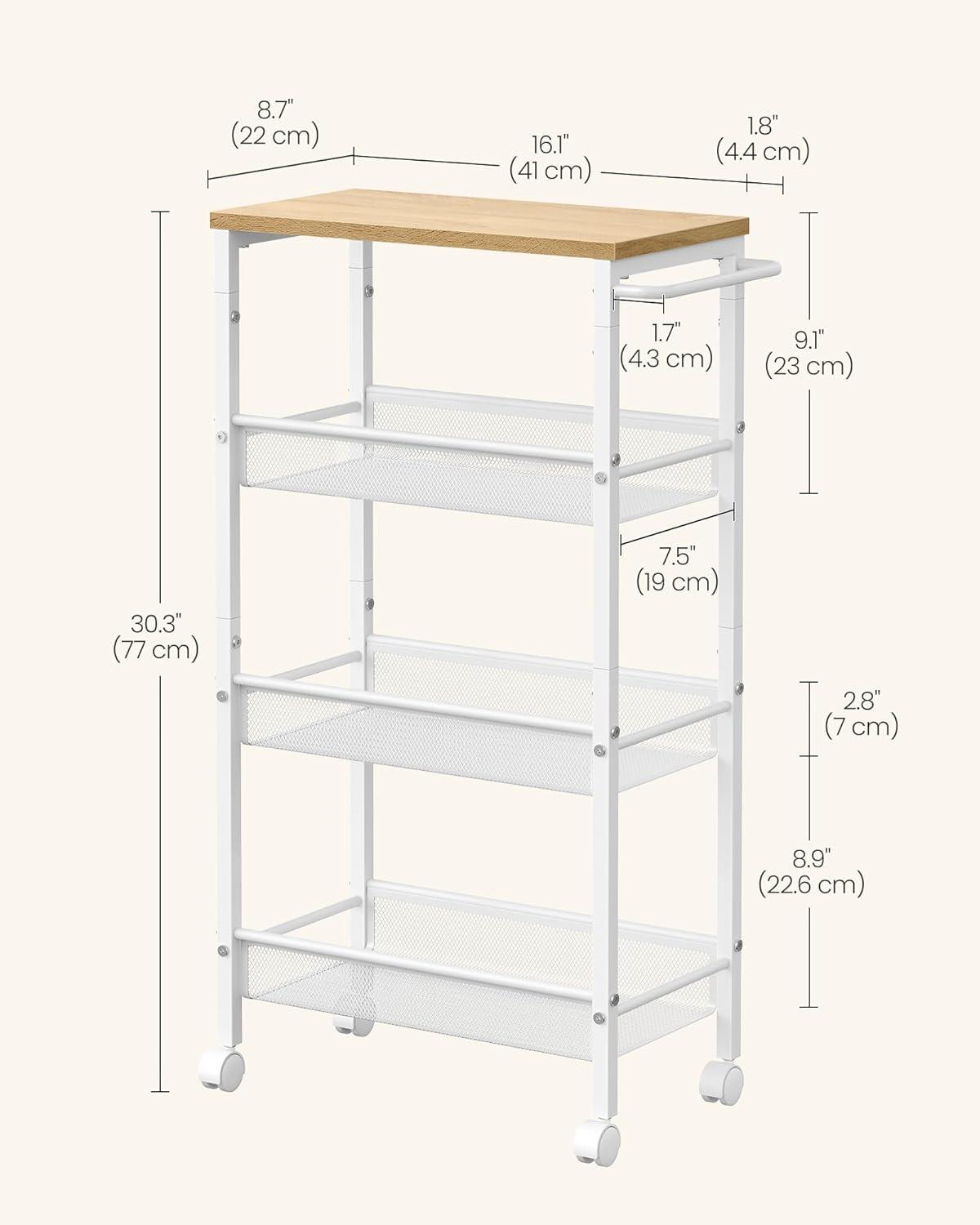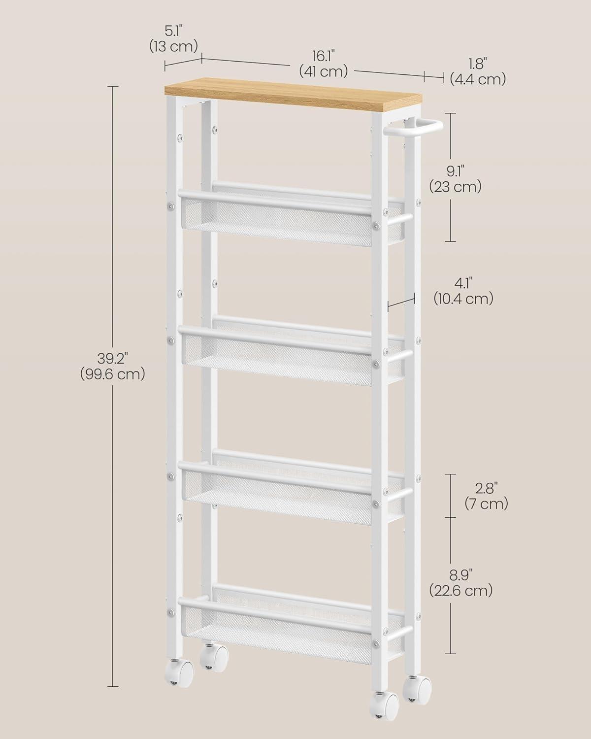 【DELIGHTS NARROW SPACES】This slim rolling cart, sized at 8.7″D x 17.9″W x 30.3″H, easily fits the narrow gap between your kitchen counter and refrigerator for added storage