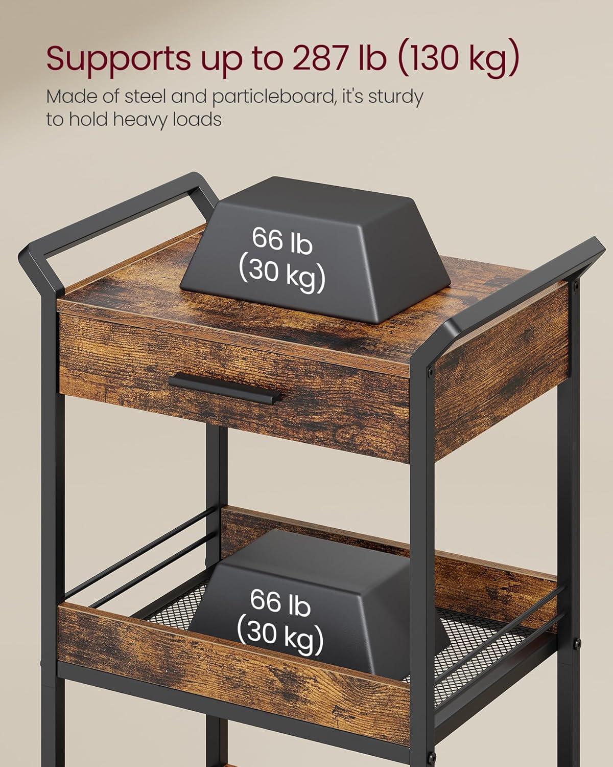 【ROBUST AND STABLE】Constructed with a quality steel frame, this rolling storage cart is designed to support up to 66 lb per shelf and top tray, and 22 lb in its drawer. Its solid construction ensures it can securely hold a large number of items
